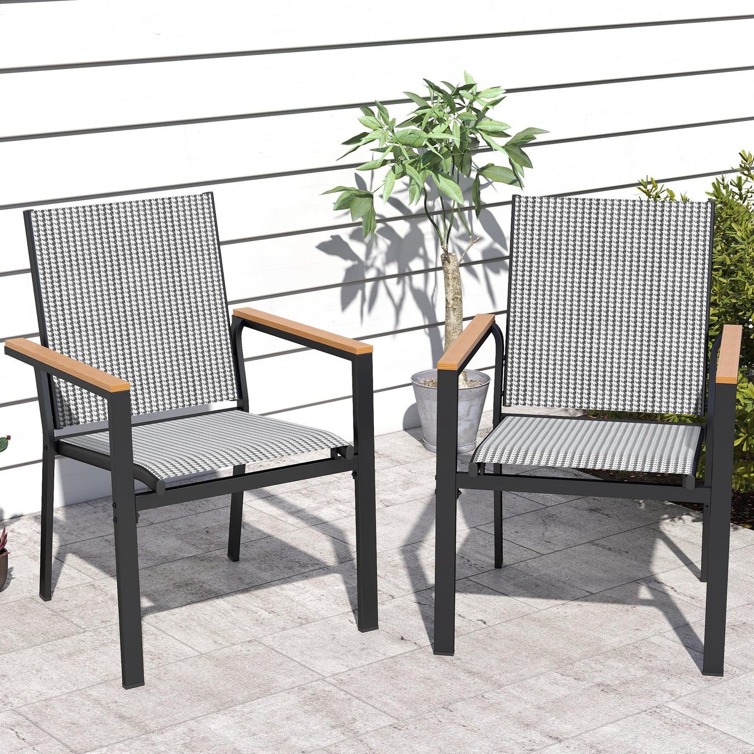 DWVO Stackable Patio Chairs Set of 2, All-Weather Patio Seating with Olefin Fabric and Faux Wood Armrests, Black & White Plaid Pattern