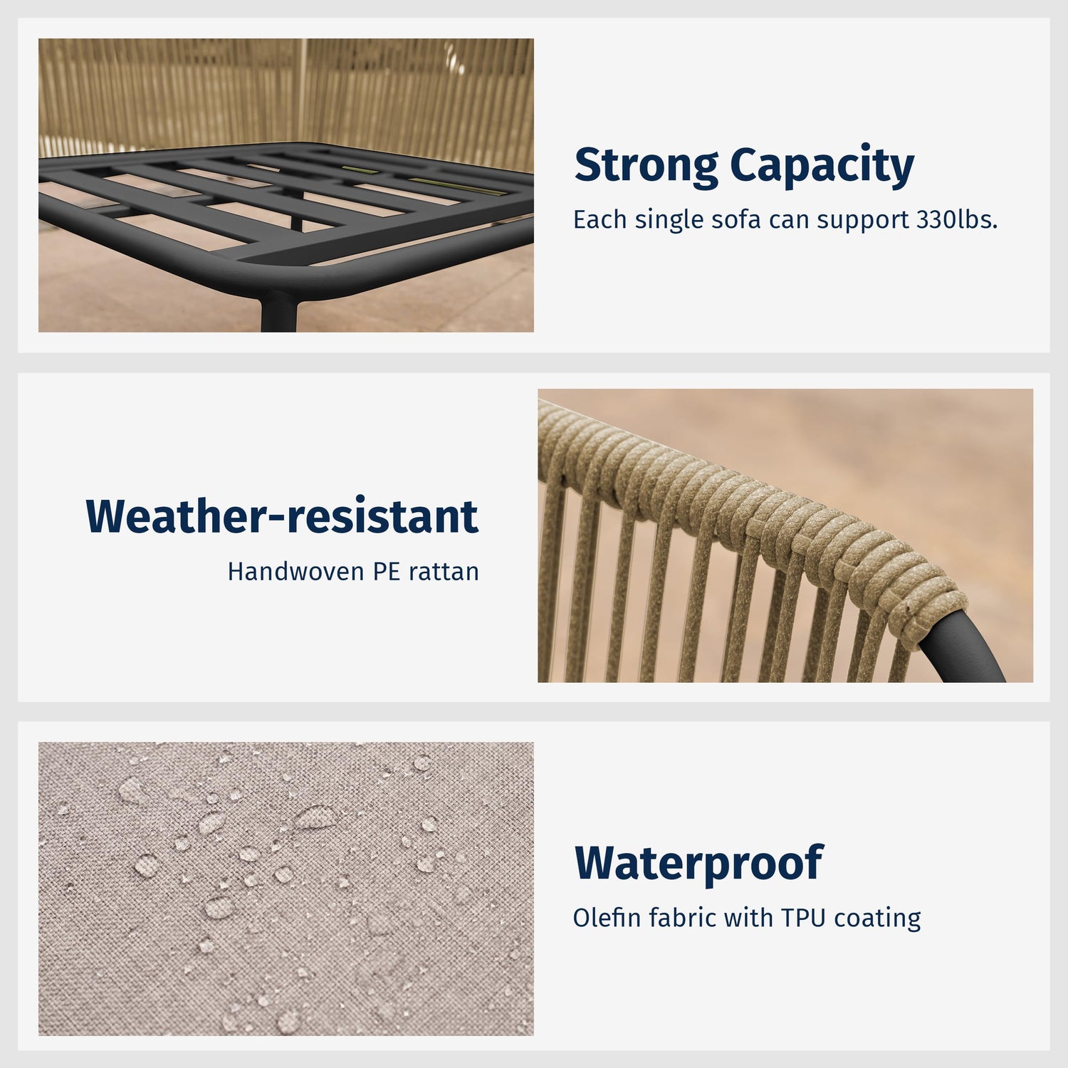 • Sturdy and Durable: Featuring a powder-coated metal frame, our furniture set offers rust and weather resistance, with rounded edges on the armrests for safety. Each seat can support up to 330 lbs, providing strength and reliability for years to come.