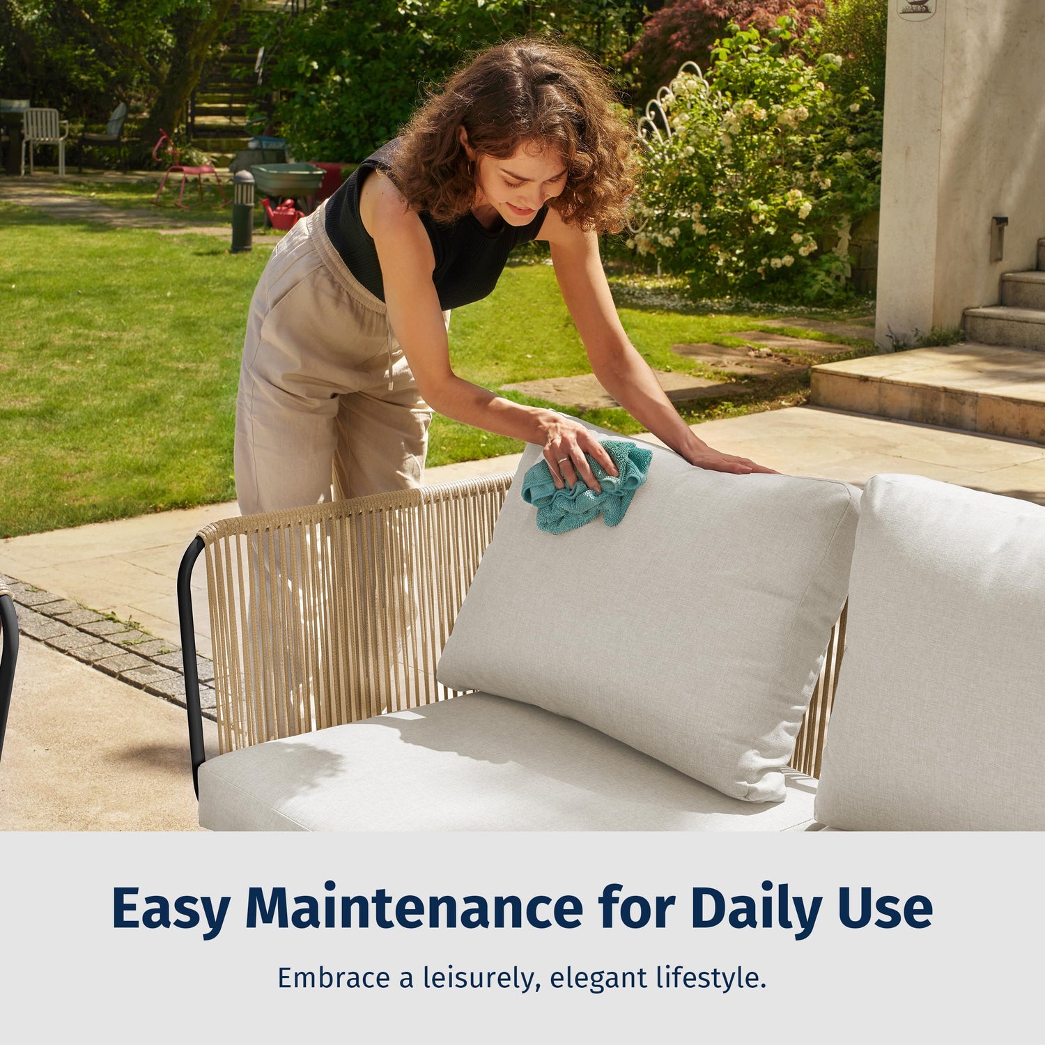 • Simple Maintenance: Designed for easy upkeep, cleaning becomes effortless with removable cushions that are easy to wash. Wipe the glass tabletop without leaving watermarks and clean the PE rattan with cloth, keeping everything looking fresh and inviting.