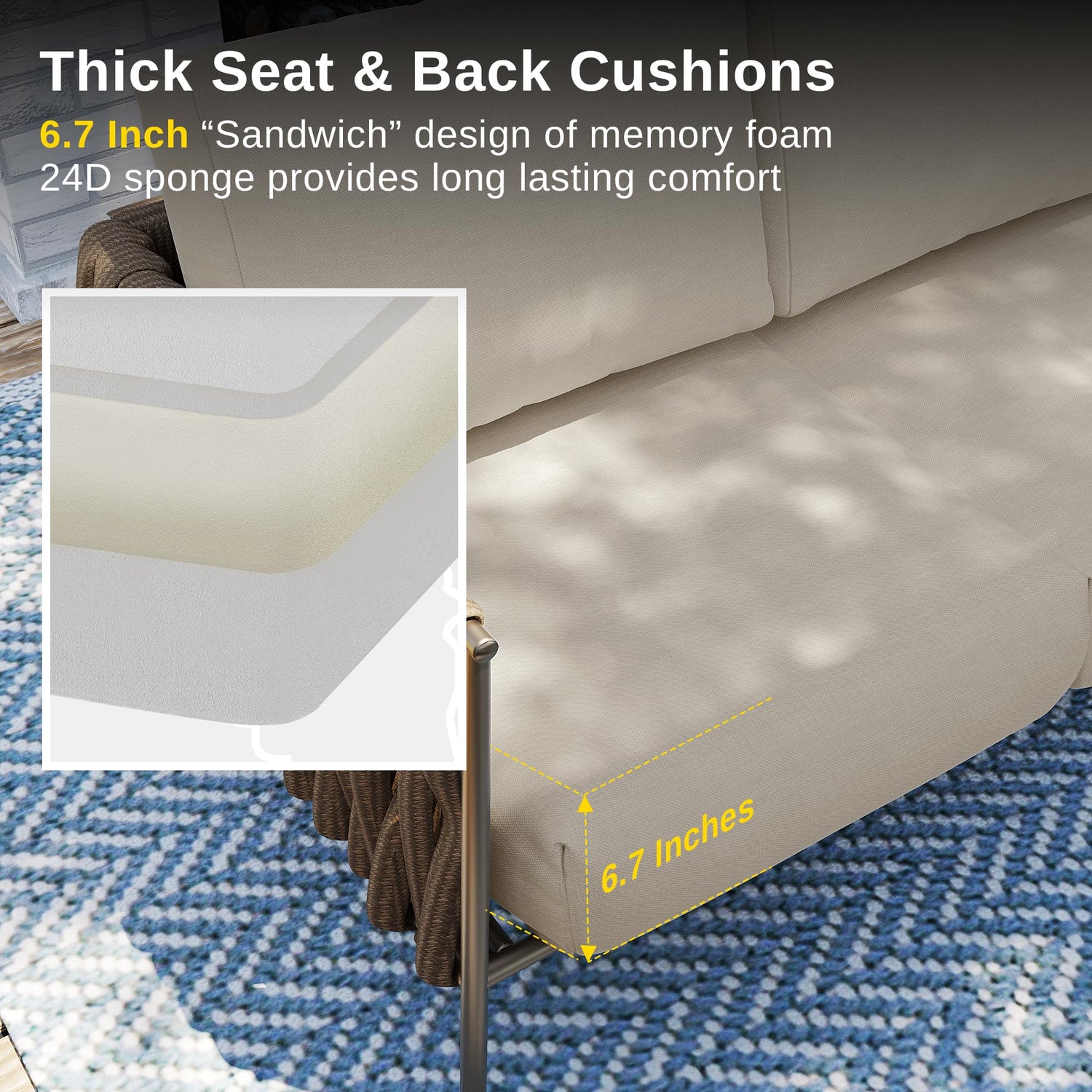 • EXTRA THICK SEAT & BACK CUSHIONS: The padded seat and back cushions of EAST OAK patio furniture 3-seat sofas are composed of 6.7 inches high-quality and high resilience sponge. It Can maintain shape after long use. You will feel very comfortable & relaxed when leaning on. Not tired of sitting for a long time. Besides, the cushion cover can be removed for easy cleaning, making it look great and new for years