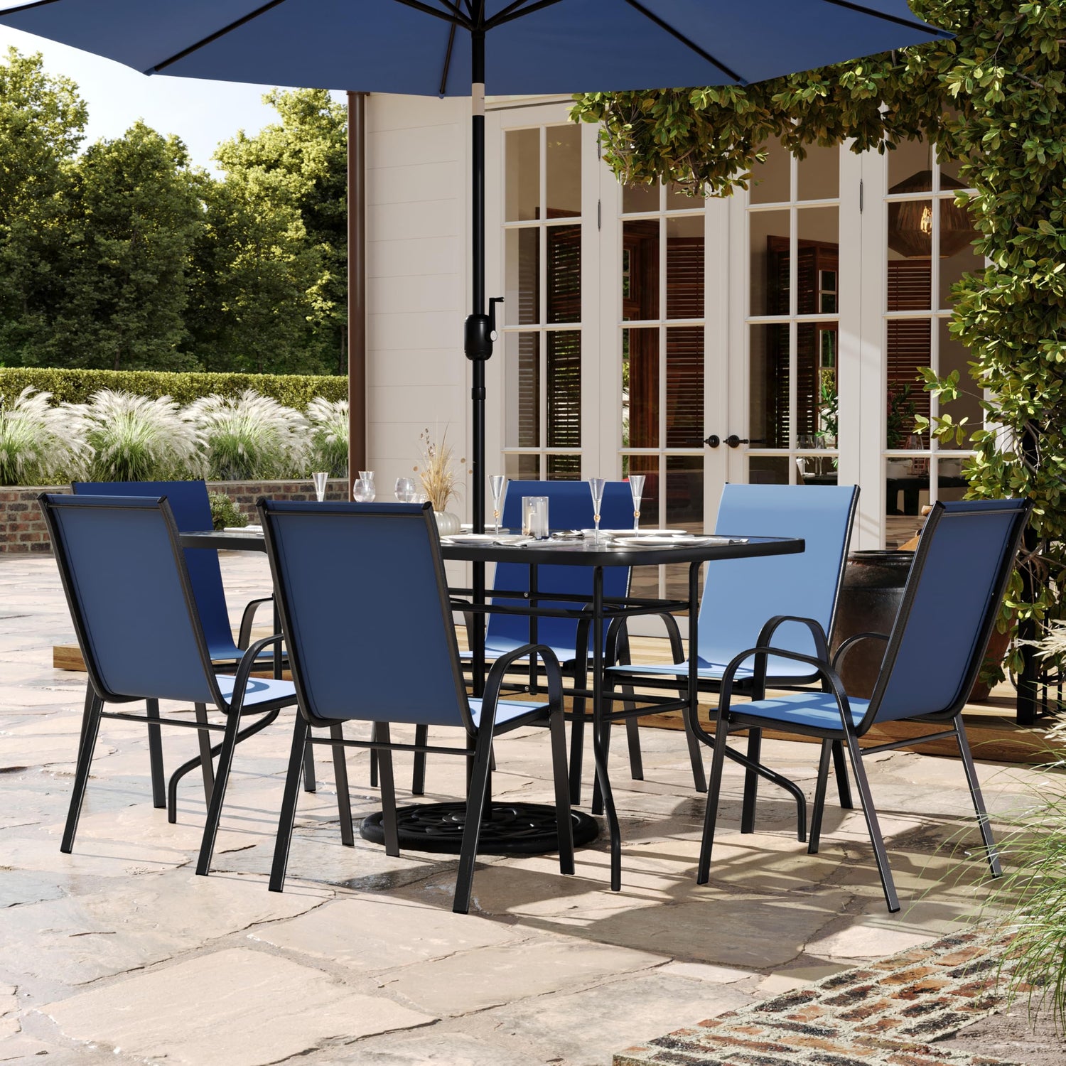 Flash Furniture Brazos 7 Piece Outdoor Patio Dining Set - 6 Navy Flex Comfort Stack Chairs - 55" Tempered Glass Patio Table with Umbrella Hole