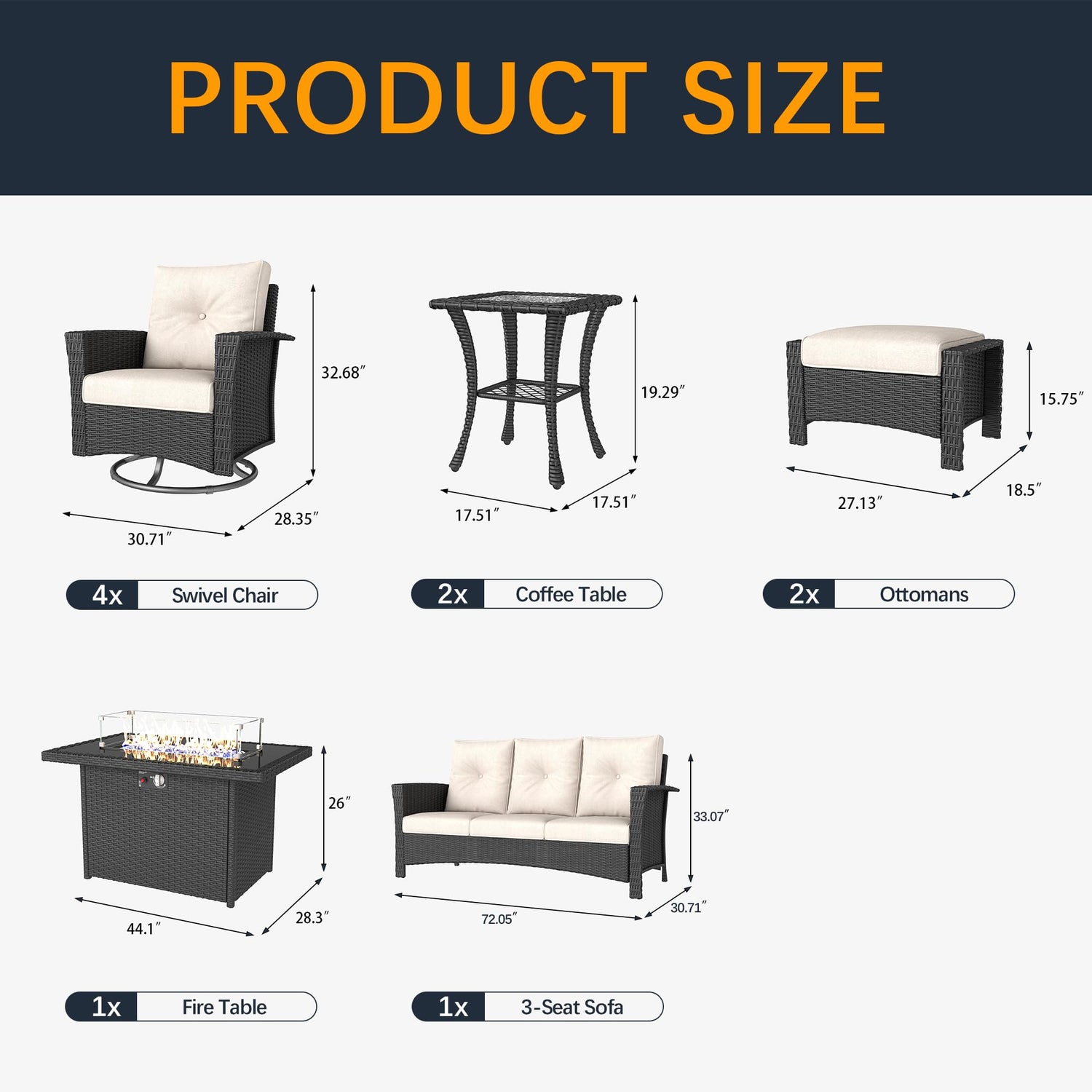 FUARTIO 10 Pieces Outdoor Patio Furniture Set with Fire Pit Table, Wicker Patio Sectional Set Conversation Wicker Swivel Chairs with Small Side Table