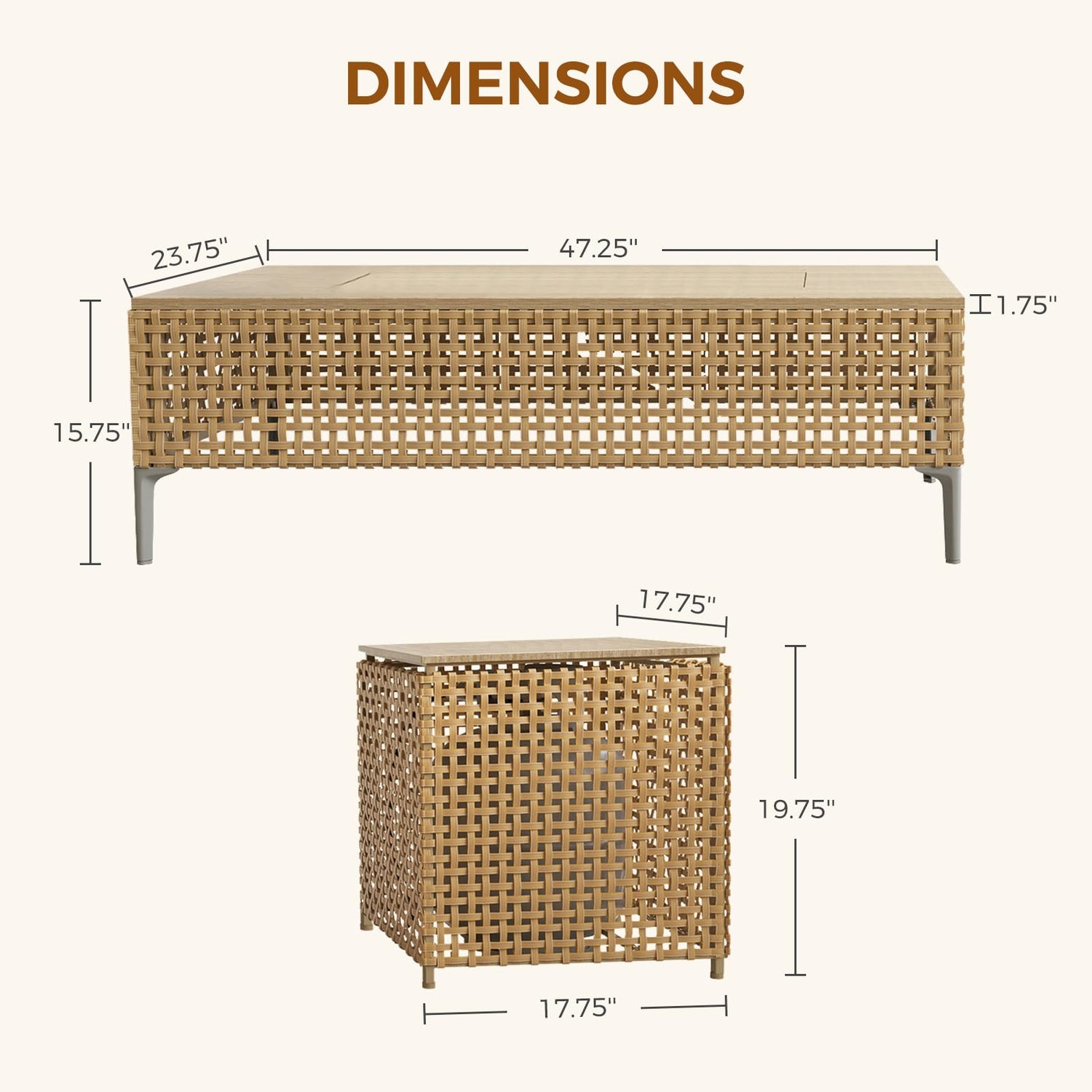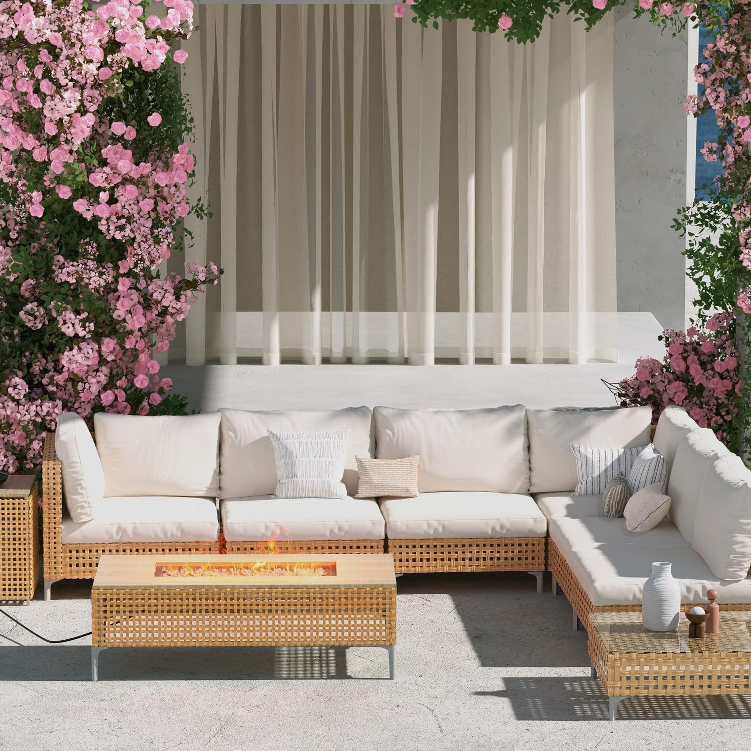 - BOHO & STYLISH DESIGN: Featuring cream cushions and matching beige wicker, this patio sofa set boasts a modern neutral color combination. Its modular sofa design allows you to customize the seating arrangement and securely lock them together. The outdoor fire pit showcases all-weather resin with an open basketwave patterned wicker, highlighting its natural texture and seamlessly complementing the flame. All seats have an anti-slip strap design so that the cushions do not slip off easily. With its relaxing boho and beach look, this set effortlessly blends with any home decor