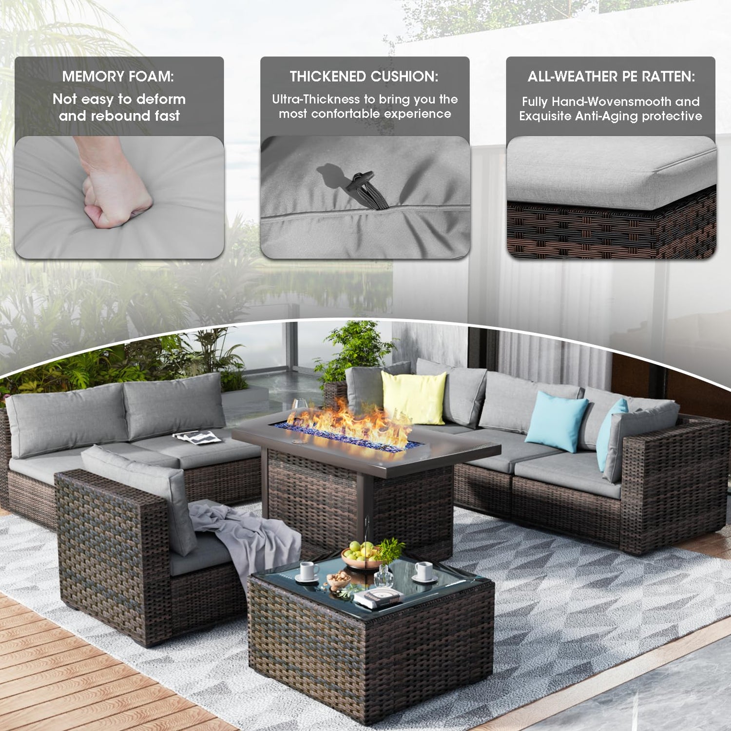 Details: GREZJXC 9 Pieces Outdoor Sectional Patio Furniture Set with Fire Pit Table PE Rattan Wicker Patio Sectional Armless Conversation Set with Cushions Grey