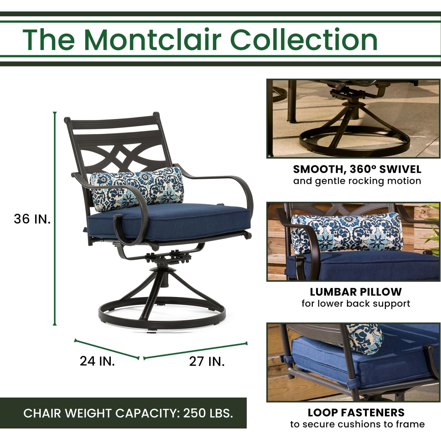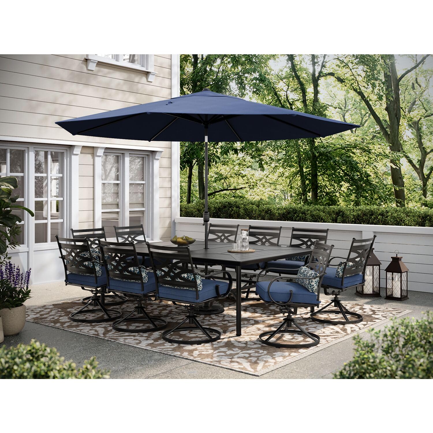 Details: Spend more time outdoors with the Montclair 11-piece patio set from Hanover. This dining set includes ten swivel rockers, 60-in. x 84-in. dining table, 11-ft. umbrella and umbrella stand. The sleek, modern frames are forged out of heavy-duty steel and treated with a multi-step finish for the ultimate outdoor protection. Items within the Montclair Collection are designed to be durable, functional, and timeless. Designer details include curved backrests, elegant curling arms, and swivel-action chair bases that can sweep guests off their feet into a full 360-degree spin. Each chair is topped with thick foam cushions and pillows that allow you to entertain your guests in fashionable comfort. The fabric is soft to the touch, yet durable enough to resist moisture, stains, and UV harm. You'll also stay cool and comfortable under the sun thanks to the coordinating table umbrella featuring an easy open/close crank and a tilt function so you can adjust the shade. Entertain in style and comfort all year long with the Montclair Collection.