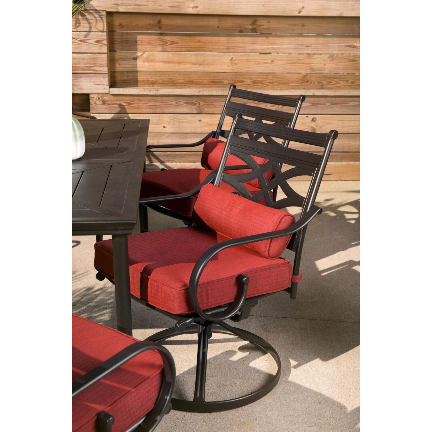 - Modern Design: This Montclair 7-piece patio dining set includes six stylish and elegant stamped back cushioned swivel rockers and a 40"x67" stamped top table all made of heavy duty steel rust-resistant frames with UV protection for all-weather use