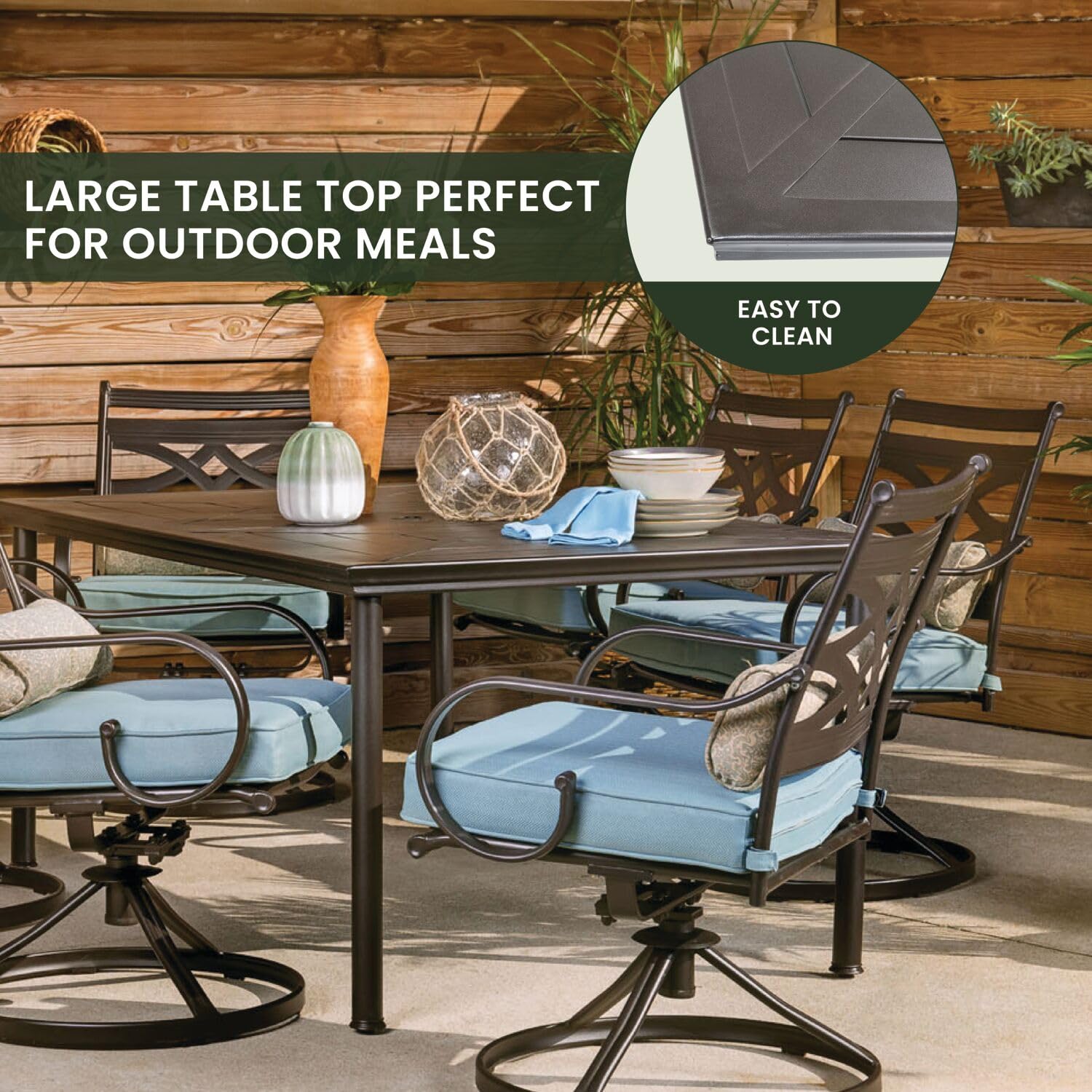 - Modern Design: This Montclair 7-piece patio dining set includes six stylish and elegant stamped back cushioned swivel rockers and a 40"x67" stamped top table all made of heavy duty steel rust-resistant frames with UV protection for all-weather use