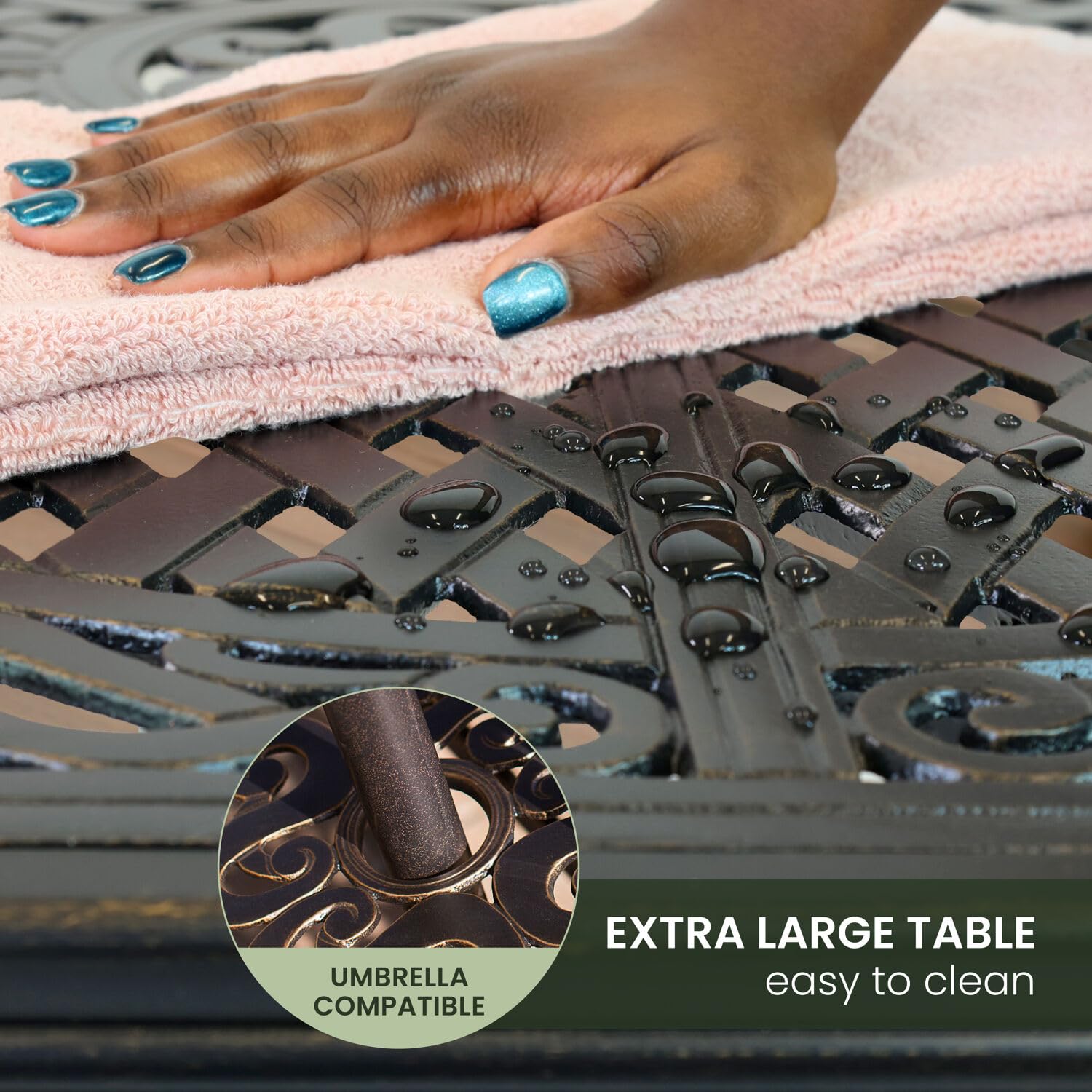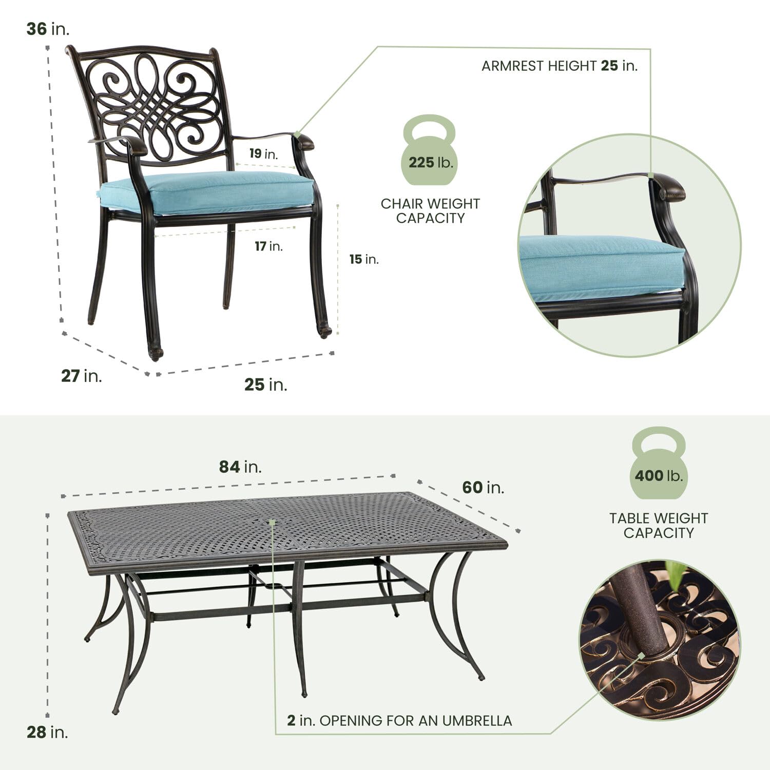 - Extra Large Dining Table: For those who enjoy an outdoor BBQ feast on those perfect spring and summer days, this 60 x 84 inch cast-top outdoor dining table includes an 2" diameter umbrella hole