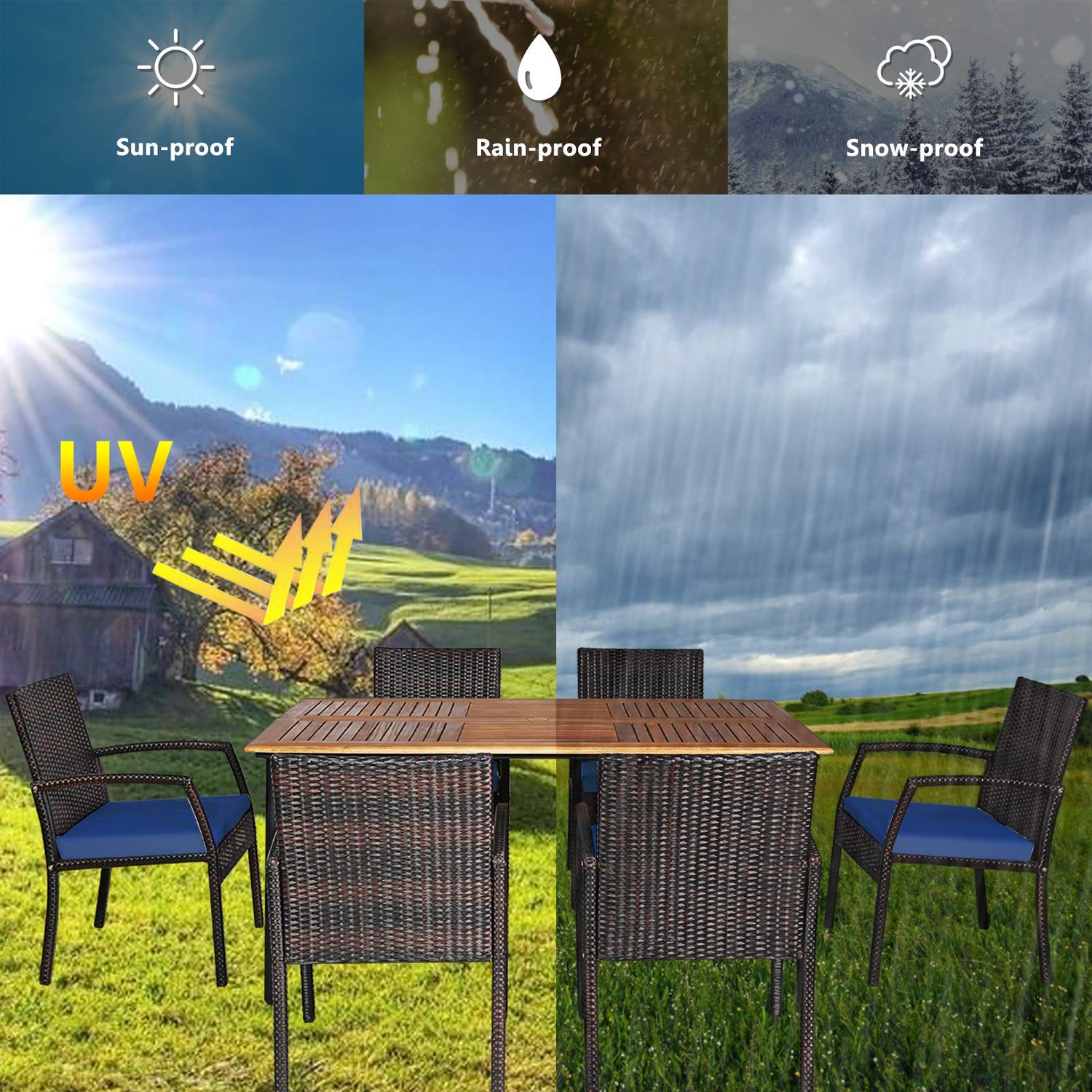 Happygrill 7 pieces patio dining furniture set is made of weather-resistant acacia wood, PE wicker and powder-coated steel, which ensures the long service life and durability. The umbrella hole is specially designed for your umbrella, so that you can have a shade in the hot weather. The armchair with high elastic cushion is in an ergonomic design to provide you with extreme comfort. In addition, this stylish dining set can add a touch to your outdoor space and fit any decoration style.