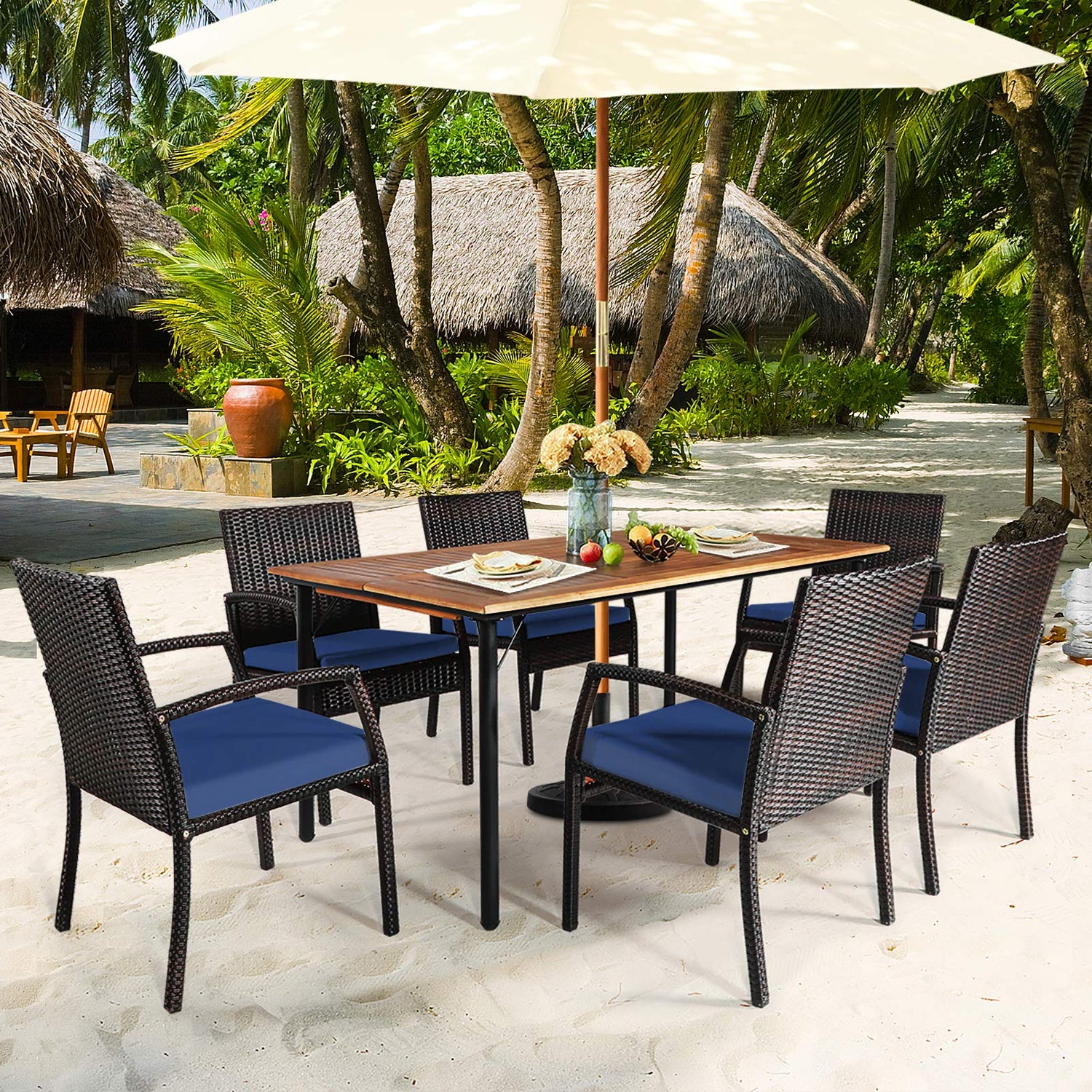 HAPPYGRILL 7 Pieces Patio Dining Set Outdoor Furniture Rattan Wicker Dining Set with Umbrella Hole, Powder Coated Steel Frame, Acacia Wood Dining Table and Armchairs with Removable Cushions