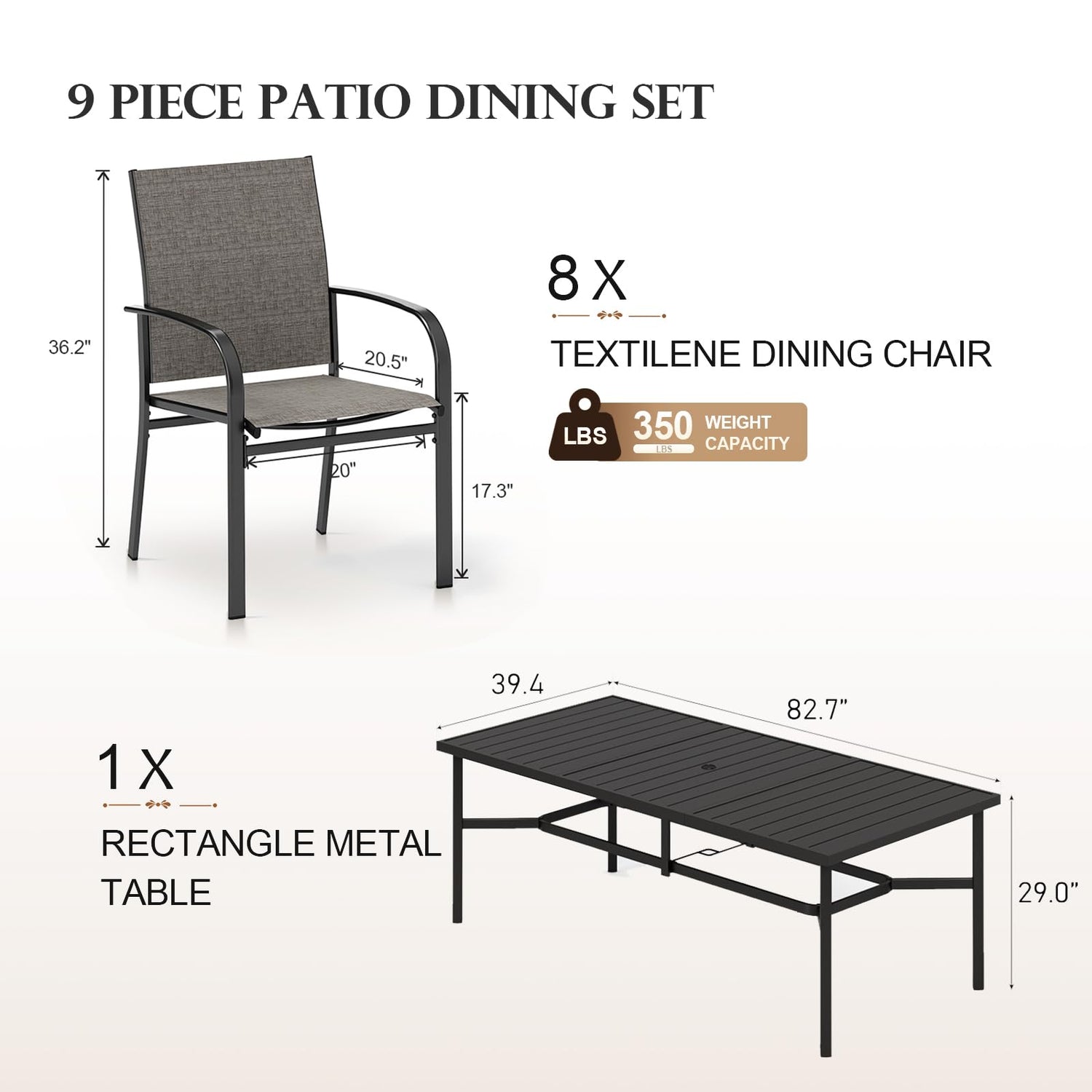 HERA'S HOUSE 9 Pieces Patio Dining Set, 8 x Brown Textilene Patio Chairs and 1 x 83 Large Rectangle Dining Table, Outdoor Furniture Set for Deck Garden Backyard Lawn Poolside