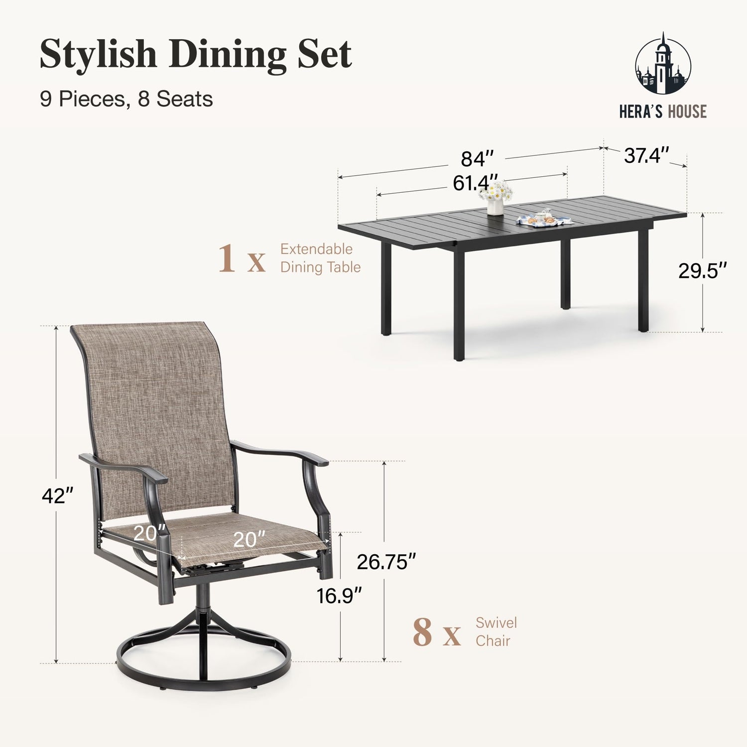 • 【Expandable Table&8xSwivel Chairs】 Including 1 x expandable patio table, 8 x swivel dning chairs. The adjustable table that can be extended from 62” to 84” can accommodate the dining needs of 6 to 8 people. High-back swivel chairs can rotate 360 degrees effortlessly, enabling easy and intimate conversations with your family and friends.Ideally suited for your backyard, poolside, balcony, garden and deck to create an outdoor comfort zone.