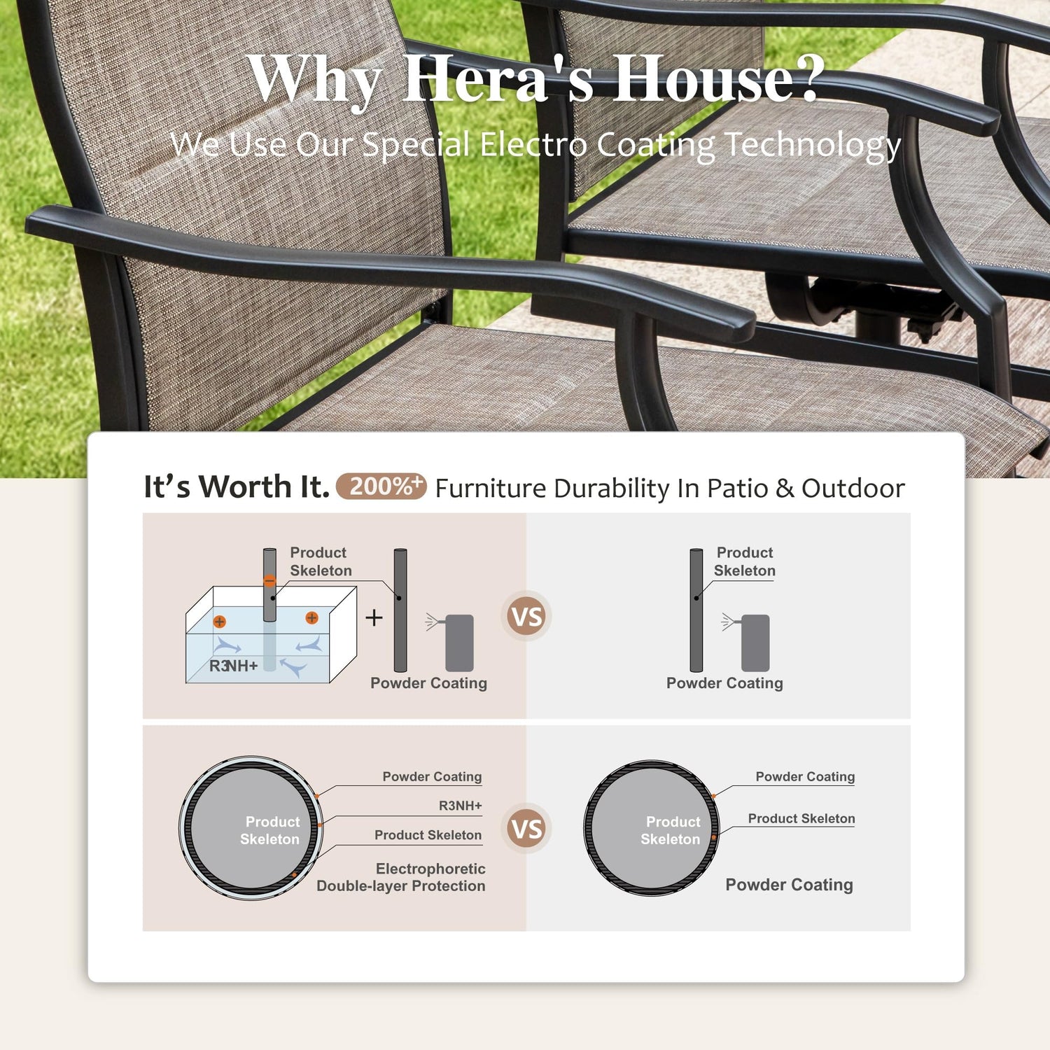• 【E-COATING & POWDER COATING】 ALL the steel frame parts are produced by high-performance E-COATING and POWDER-COATING technique which provides extended protection against rust, scratches, rain, and UV harm. All weather resistant, anti-rust, easy to clean, no special care needed
