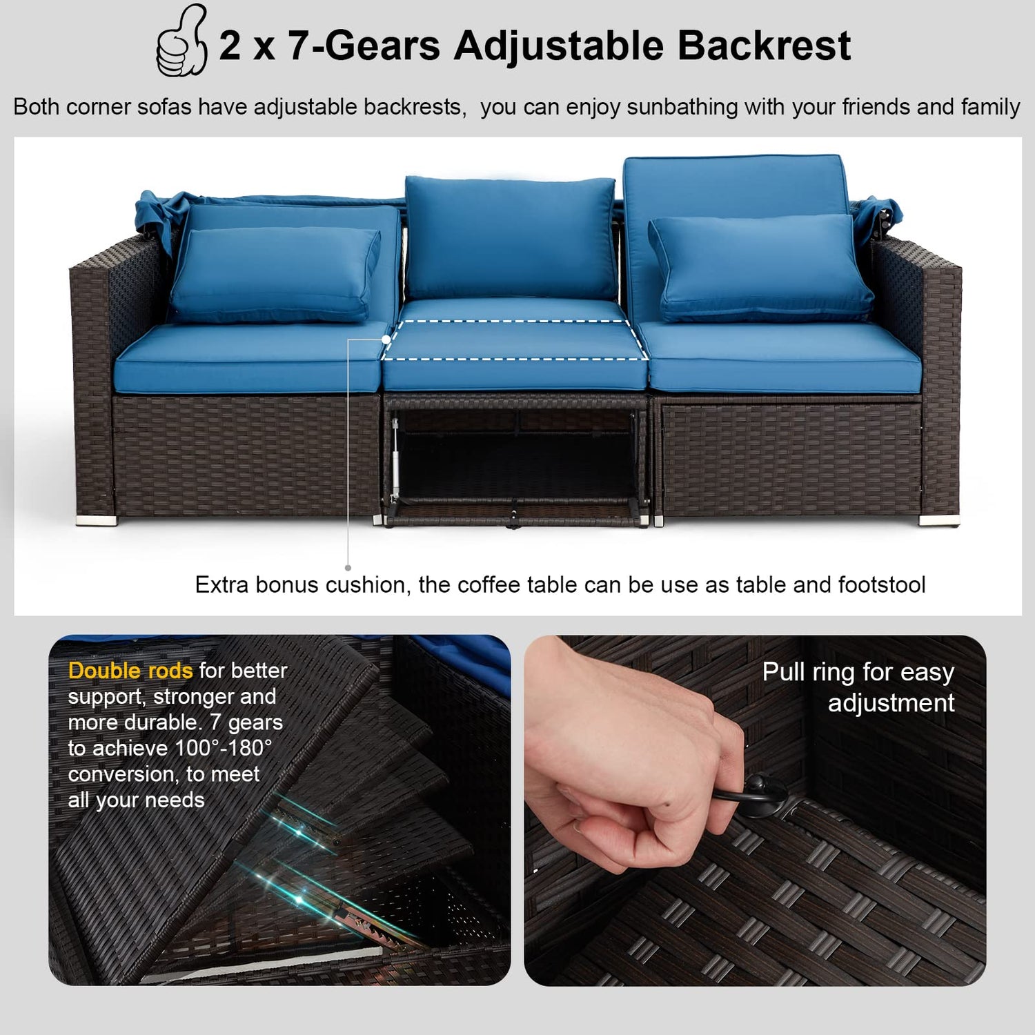 - Multifunctional Patio Rectangle Sunbed : Our patio wicker sunbed set has a retractable canopy, enjoy your summer time with a bottle of icy beer and a shady canopy! Upgraded daybed with 7-position reclining backrests on both sides, and it can accommodate three positions at the same time, and the custom angle can better support your back and legs for a luxurious leisure experience with your friends and family.