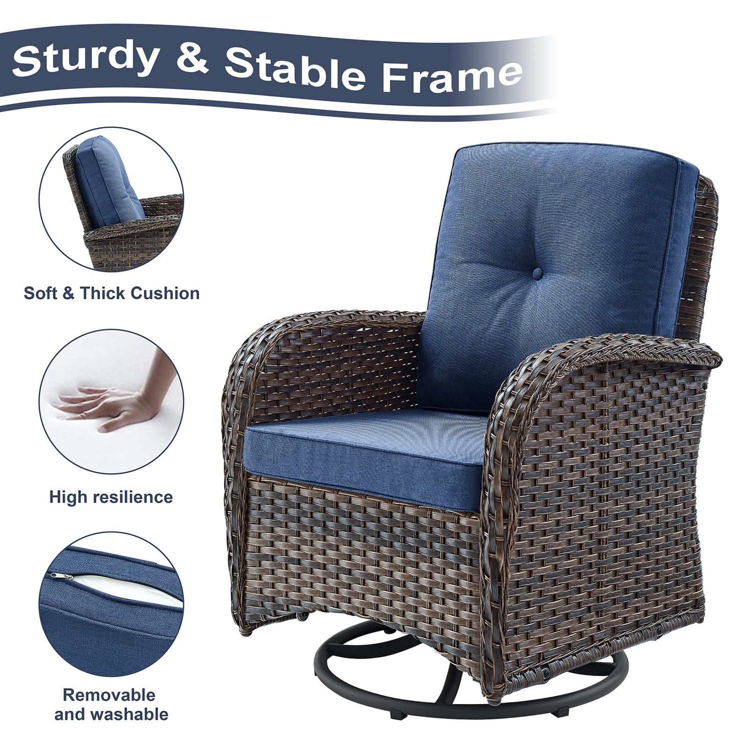 - Swivel Rocking Chairs:Resting on chairs with sturdy round metal base allows to glide gently and swivel 360° for relaxing, with seat and back cushions contribute to comfortable support, making the outdoor set a perfect addition to transform your patio.