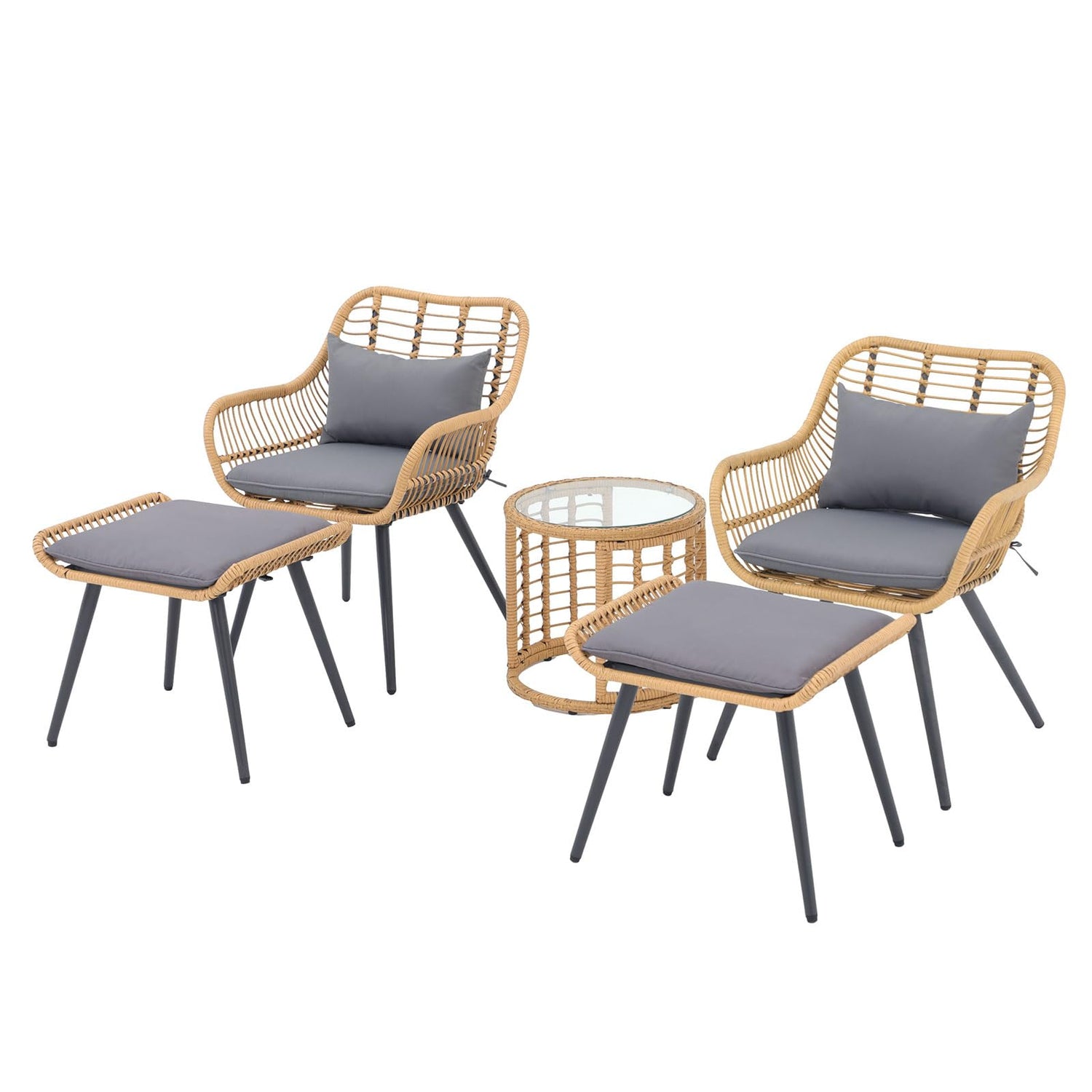 JOIVI 5 Piece Patio Bistro Set, Wicker Outdoor Patio Set with Upgraded Chairs and Ottomans, Round Glass Top Coffee Side Table, Patio Rattan Conversation Set for Balcony, Lawn, Garden, Backyard, Gray