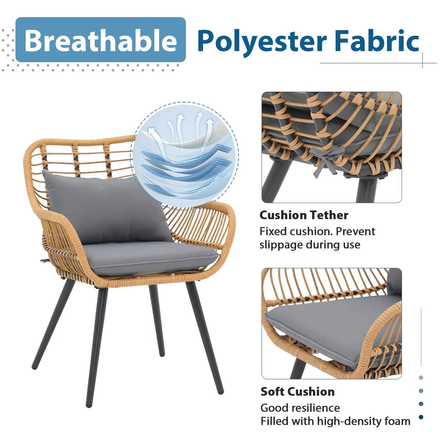 - Comfortable Seating - With spacious, deeper, and wider chairs, this sunroom furniture indoor offers excellent body support and relaxation. The cushions, secured with buttons and ropes, prevent sliding, appealing to families and businesses desiring comfortable and practical outdoor seating set.