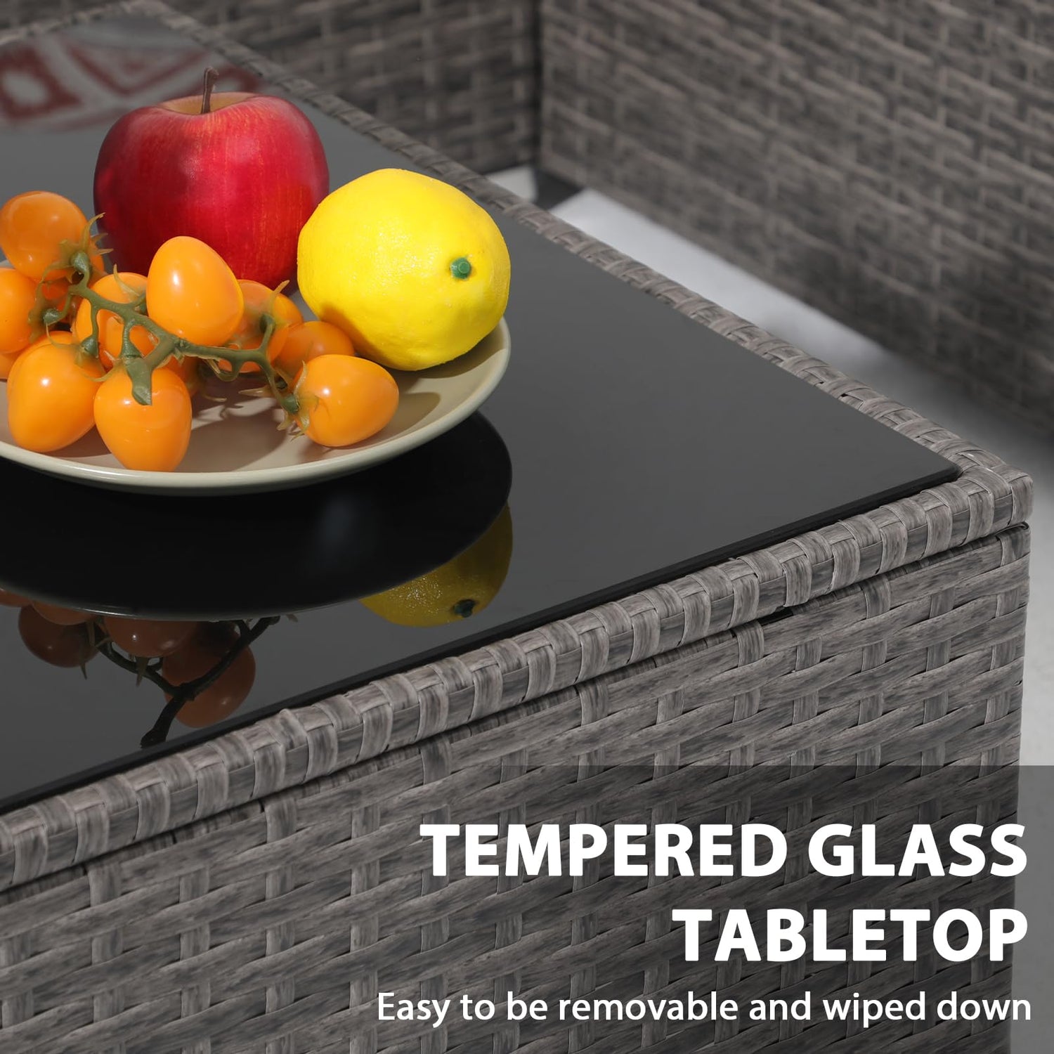 - Tempered Glass Top Coffee Table: The tabletop of this patio furniture coffee table is made of tempered glass, featuring easy to wipe and not easy to scratch. Meanwhile, it is edged in rattan with no exposed edges, plus it comes with suction cups underneath the tabletop. All these designs ensure safety and stability for daily use, as well as easy removal