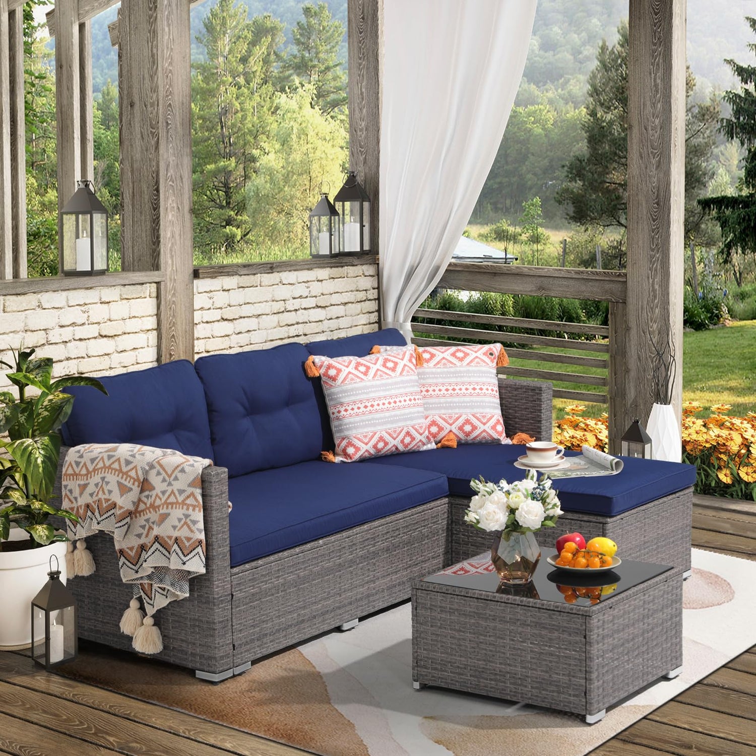 JOIVI Outdoor Patio Furniture Set, Small Sectional Conversation Set, All-Weather Wicker Furniture Sofa Set, L-Shaped Outdoor Patio Seating with Cushions, Tempered Glass Coffee Table, Navy Blue