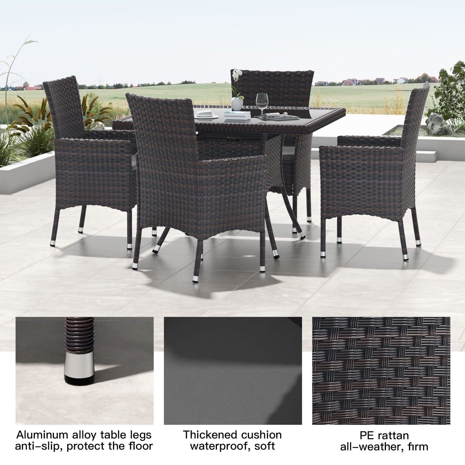 • Modern Design Furniture Set:Wicker dining table designed in a contemporary style with a tempered glass top and four matching chairs,table dimensions:35.43"(L) x 35.43"(W) x 29.52"(H);chair load capacity:551 lbs,can comfortably accommodate 8 people,creating a stylish,elegant atmosphere for your living environment