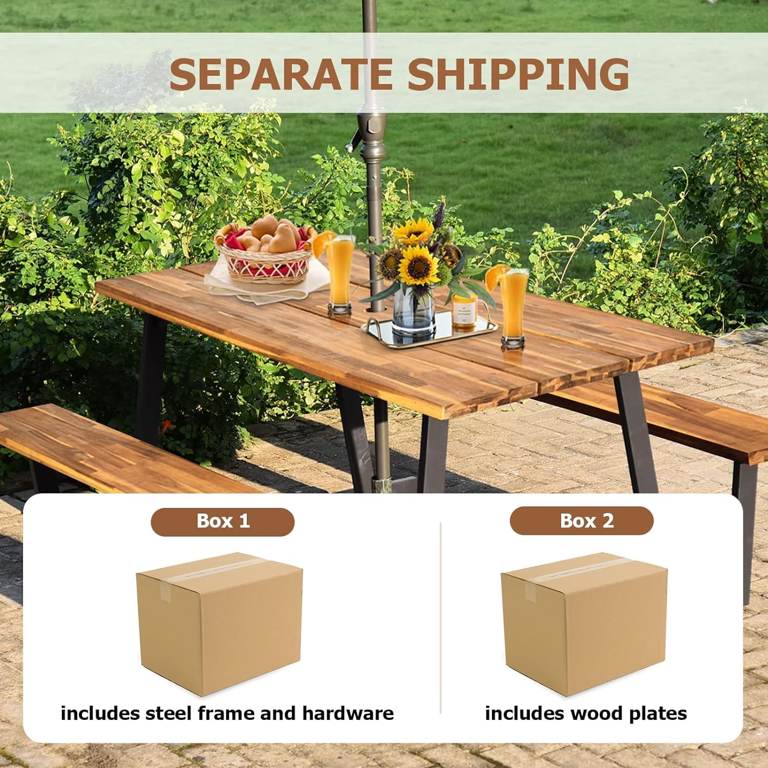 LDAILY Picnic Table, 70’’ x 30’’ Outdoor Wood Dining Table Set with Bench, 2" Umbrella Hole, 1600 LBS Max Load, Metal Frame Picnic Tables for Outdoors 6-8 Persons in Party, Garden, Yard, Patio, Lawn