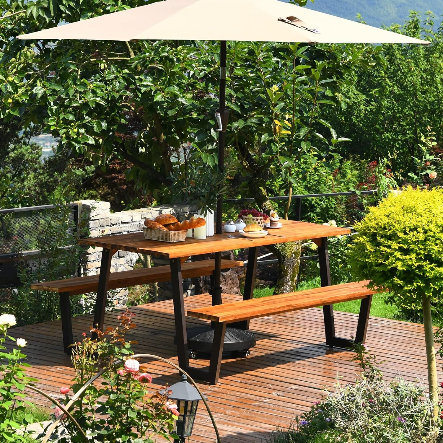 - ☀️【Not a Simple Table - Umbrella Hole】This table has a 2'' removable umbrella hole to accommodate most sunshades. Considering that floors may be uneven, the adjustable feet that allow the dinning table to stay level on even slightly uneven ground. Dimension: the table top is 70’’ long and 30’’ wide. The bench measures 70’’ in length and 10’’ in wedth. The height of the table top is 30’’.
