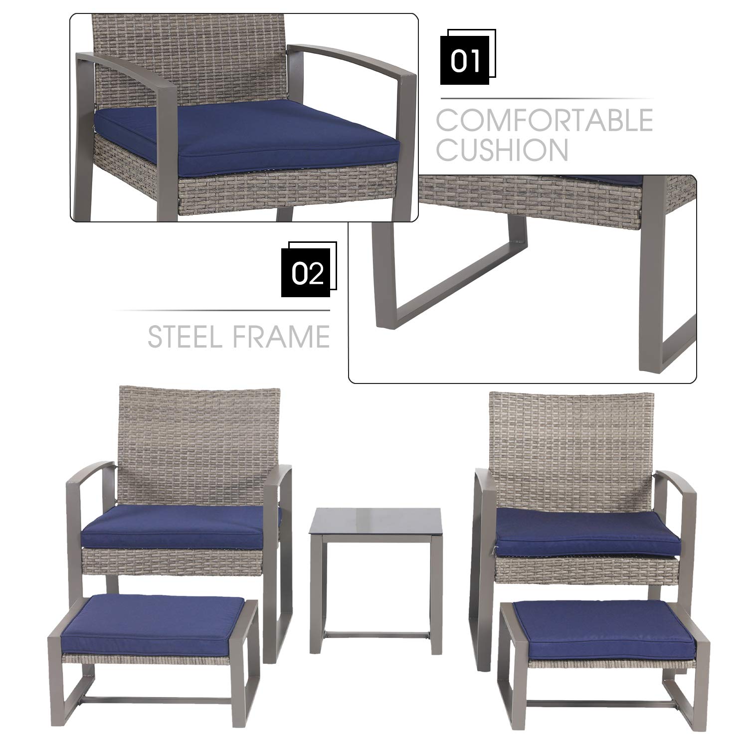 - UPGRADED COMFORT - The outdoor furniture set comes with thick cushioned ottomans which give you additional seating or a place to prop up your feet, offering upgraded comfort. You can enjoy leisure time with your friends for optimal comfort and relaxation.