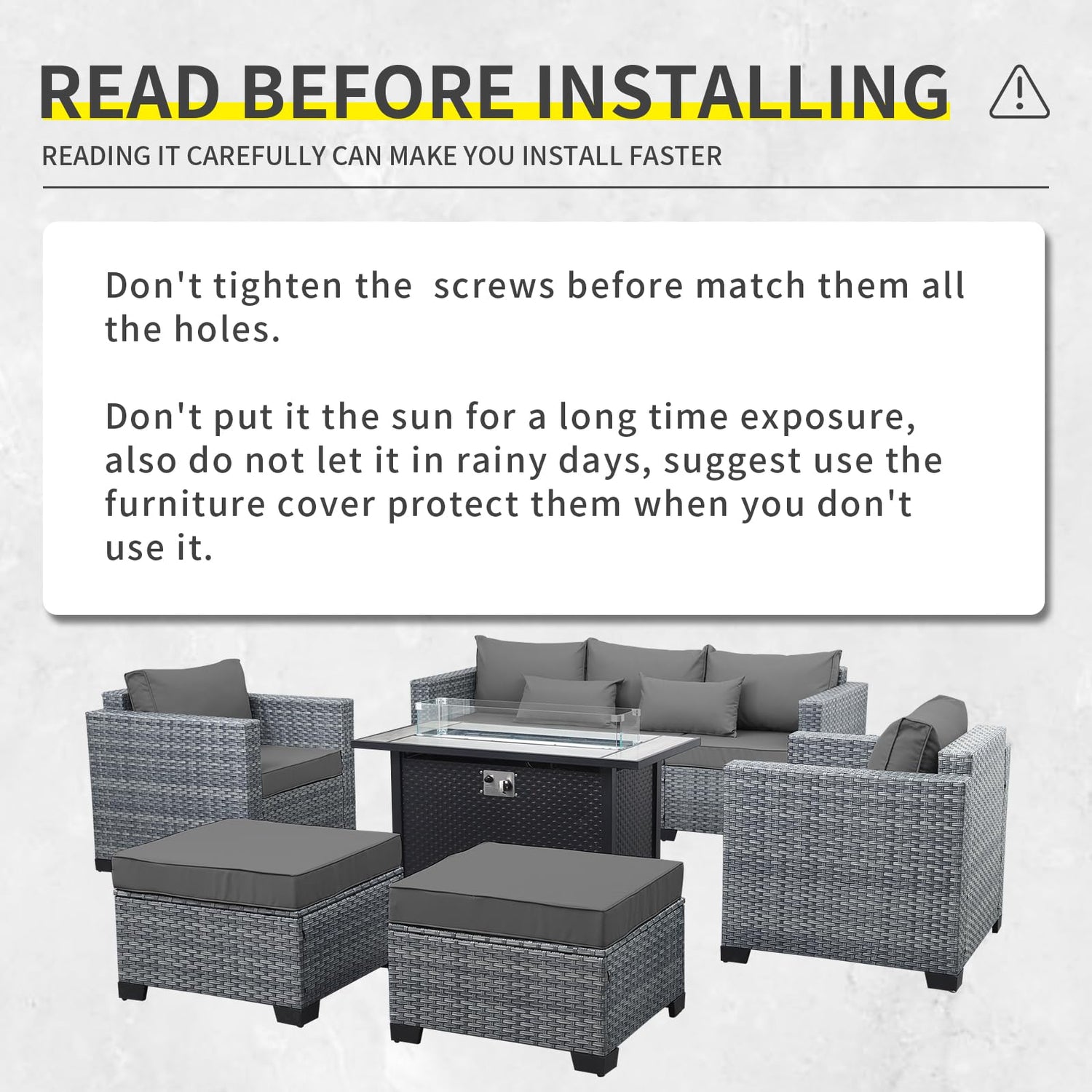 Lviden 6 Pieces Wicker Patio Furniture Sets Outdoor Conversation Set PE Rattan Sectional Sofa Couch with 45" Fire Pit Table and Grey Cushions