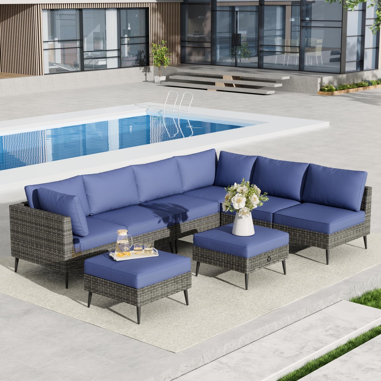 - Stylish and Modular Design: Our 8 - piece outdoor patio furniture set features a modern design. It includes sectional sofas with cushions and an ottoman with a hidden storage. The matching footstool has 2 - in - 1 functions, convertible into a coffee table. Our modular design allows for multiple configurations, easily rearranged for special occasions, like backyard, patio, garden or balcony and so on.
