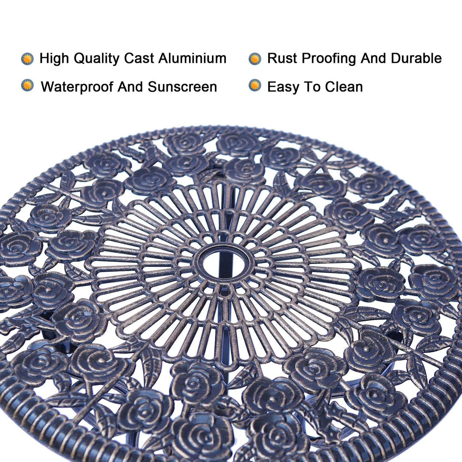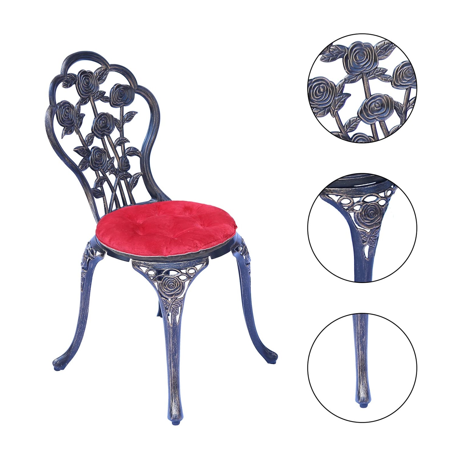 • CAST ALUMINUM :This outdoor table and chairs set made of high quality cast aluminum.Waterproof and sun resistant,rust proofing and durable,easy to clean,elegant Rose pattern antique finish adorn the table and chair . The surface of the table and chair is smooth without burr,you will get two pillows to Improve your sitting comfort