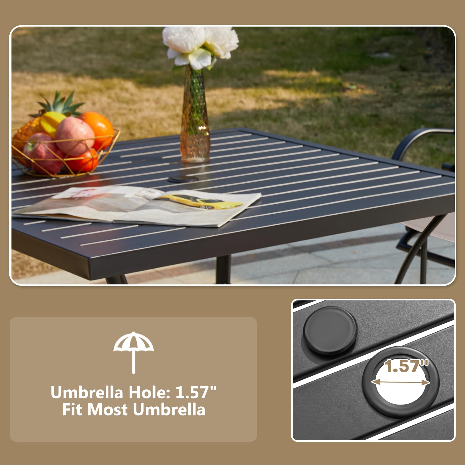 - Patio Table with Umbrella Hole:Equipped with a 1.57" umbrella hole (fits most market umbrellas), this patio table with umbrella hole ensures shade in sunny days. Powder-coated steel frame and weather-resistant metal desktop withstand rain and rust, perfect for year-round outdoor use