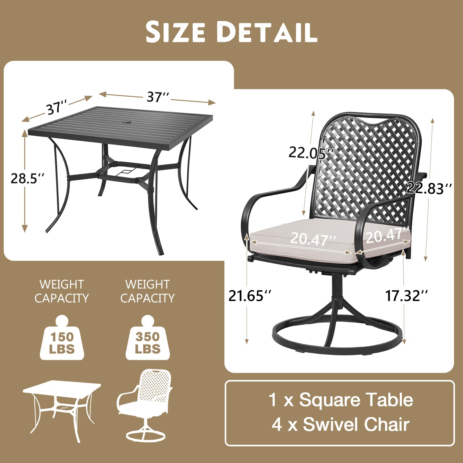 MELLCOM 5 Pcs Outdoor Dining Set, 4 Swivel Rocker Chairs with Thick Cushions & Square Dining Table with Umbrella Hole, Patio Furniture Set for Porch, Beige