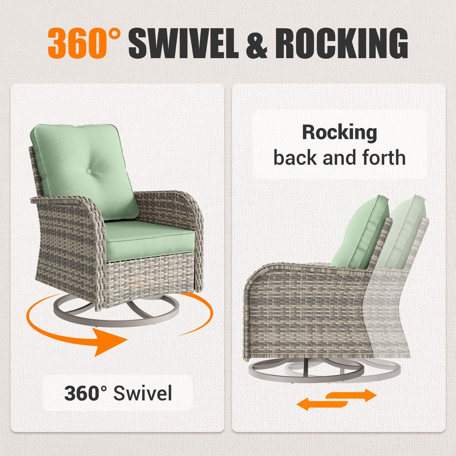 Muphyers 13-Piece Outdoor Patio Furniture Set with Rocking Swivel Chair, Wicker Rattan Sectional Sofa Conversation Set with 55,000 BTU Fire Pit Table with Ottomans, Backyard Furniture, Light Green