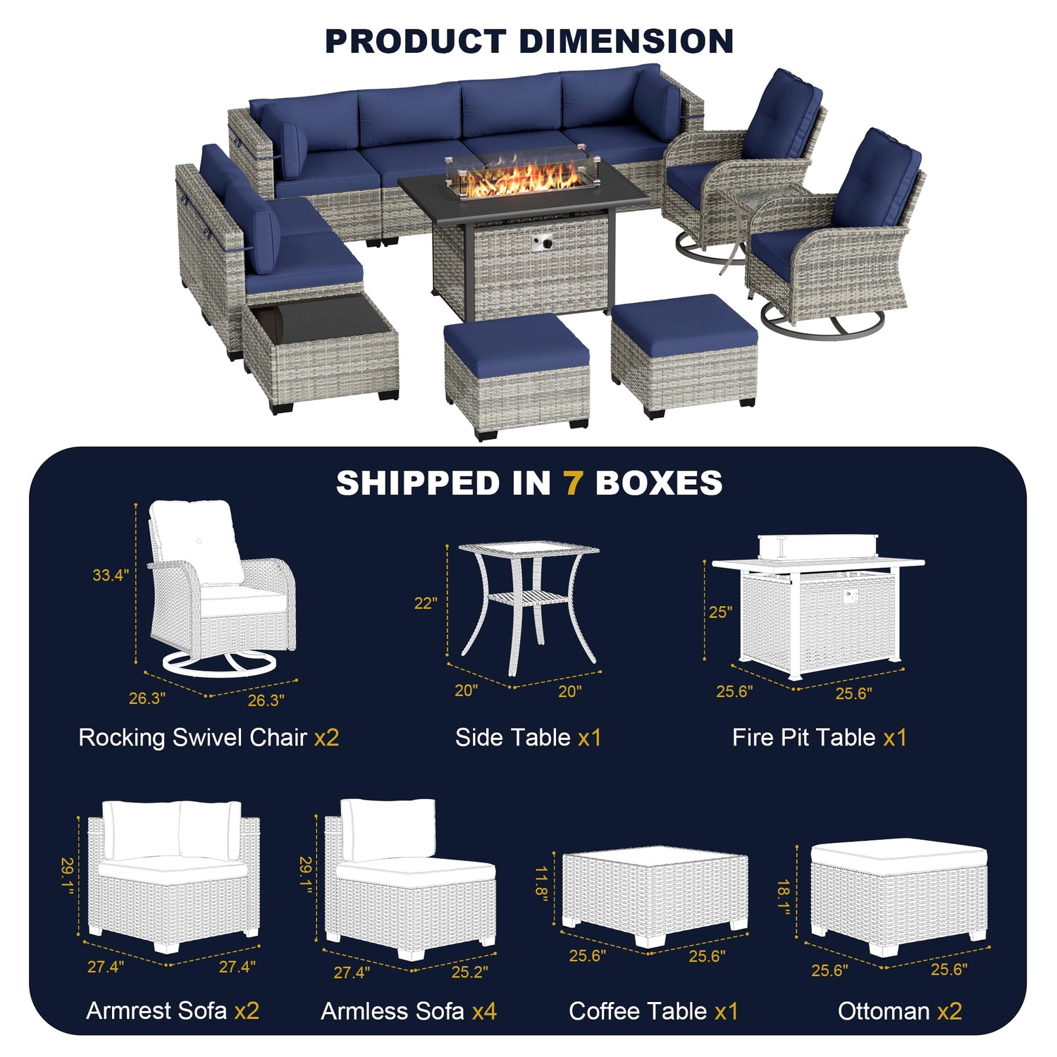 Muphyers 13-Piece Outdoor Patio Furniture Set with Rocking Swivel Chair, Wicker Rattan Sectional Sofa Conversation Set with 55,000 BTU Fire Pit Table with Ottomans, Backyard Furniture, Navy Blue