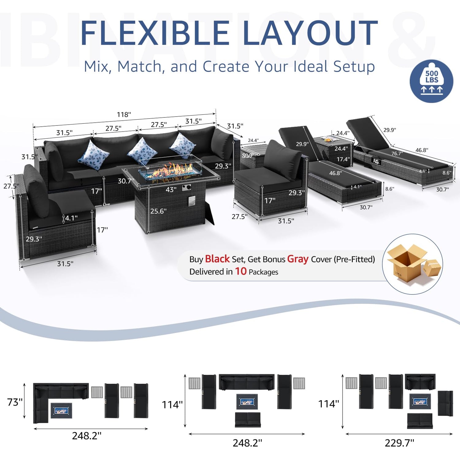 - SET INCLUDE: This elegant 11 Pcs modular luxury patio sofa set includes a fire pit table, two corner chairs, four armless chairs, two chaises, two side tables, and a separate package of black cushion covers; The cushion covers are designed with removable zipper for easy changing, along with the grey sofa covers originally installed on your couch, you'll get two different colors to match as you outdoor decoration