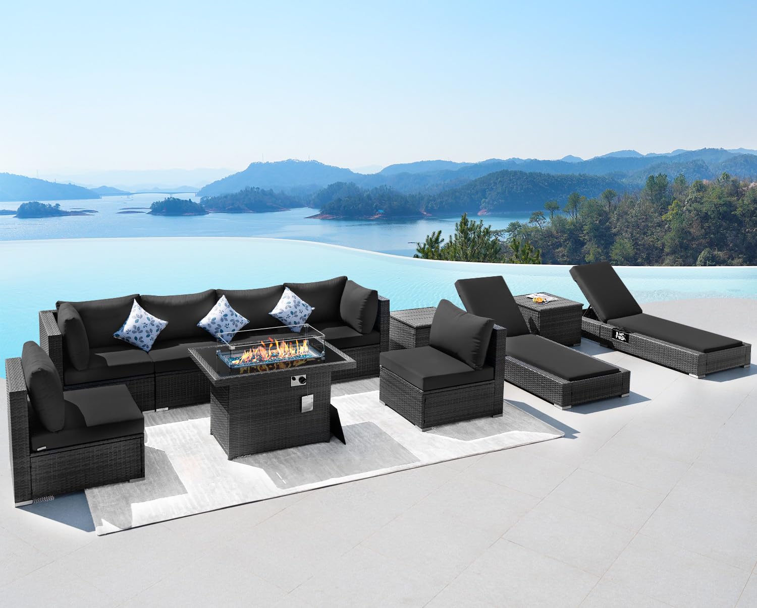 NICESOUL 11 Piece Outdoor Patio Conversation Set with Fire Pit Natural Gas/Propane, 29.3'' High Back Sectional Furniture w/Chaise Lounge, Deep Large Seating Sofa Couch, 2 Color Cushion Black & Gray