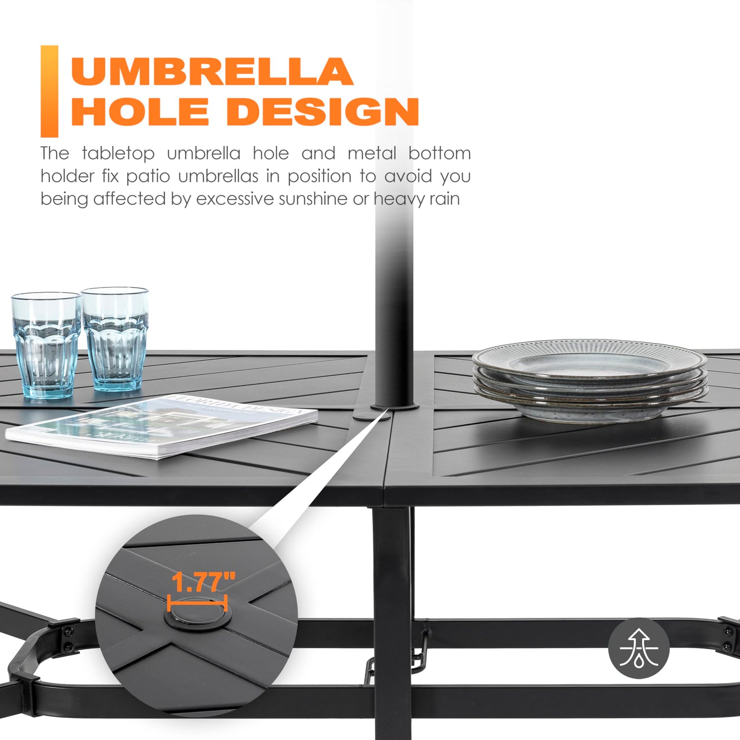 - Umbrella Hole: A 1.8'' umbrella hole on the tabletop fits most patio umbrellas (not included) in position for precise coverage to protect you from direct harmful sunlight or heavy rain
