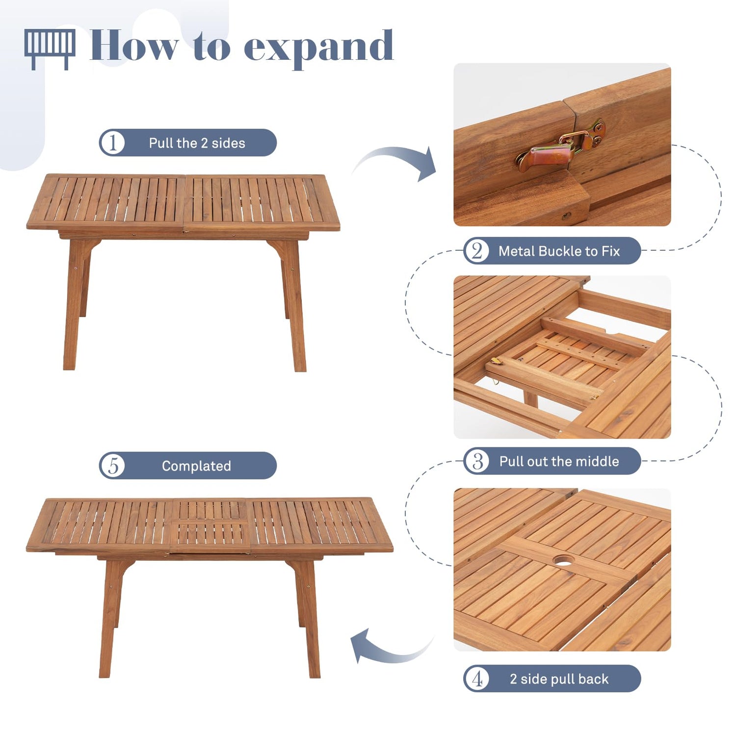 - Extendable Table with Umbrella Hole: The table expands effortlessly, stretching from 55" to 71" to accommodate 2–8 people. Its smooth, sturdy sliding mechanism simplifies adjustments, eliminating the need to switch tables for different occasions, from intimate family meals to lively outdoor parties. A central umbrella hole allows for shade against sun or light rain, enhancing practicality. NOTE: UMBRELLA AND BASE NOT INCLUDED.