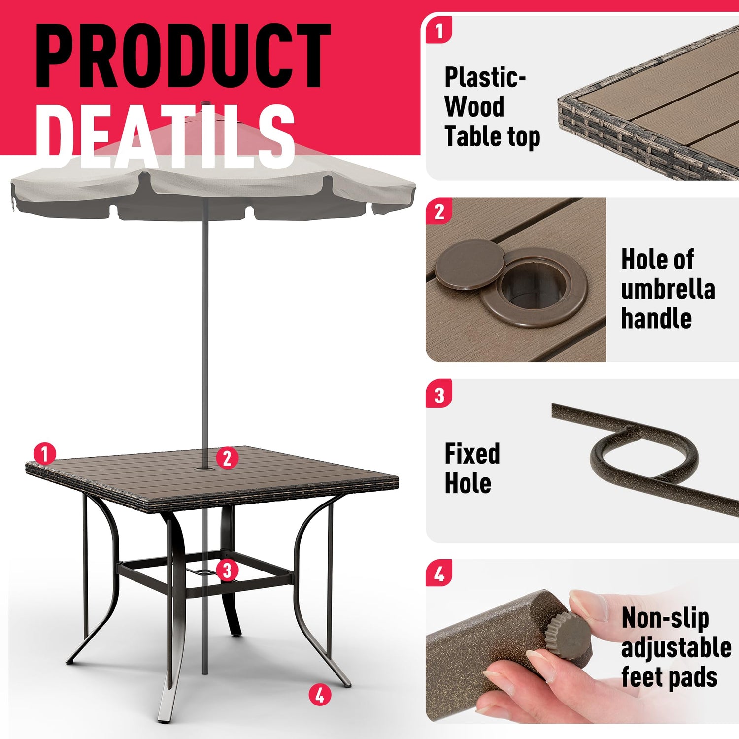 - 【Reliable Plastic-Wood Table】Featuring a new plastic-wood table top, this picnic table is more durable, dirt-resistant, and easy to clean. A 1.6-inch hole allows for adding a parasol, and adjustable legs ensure table stability.