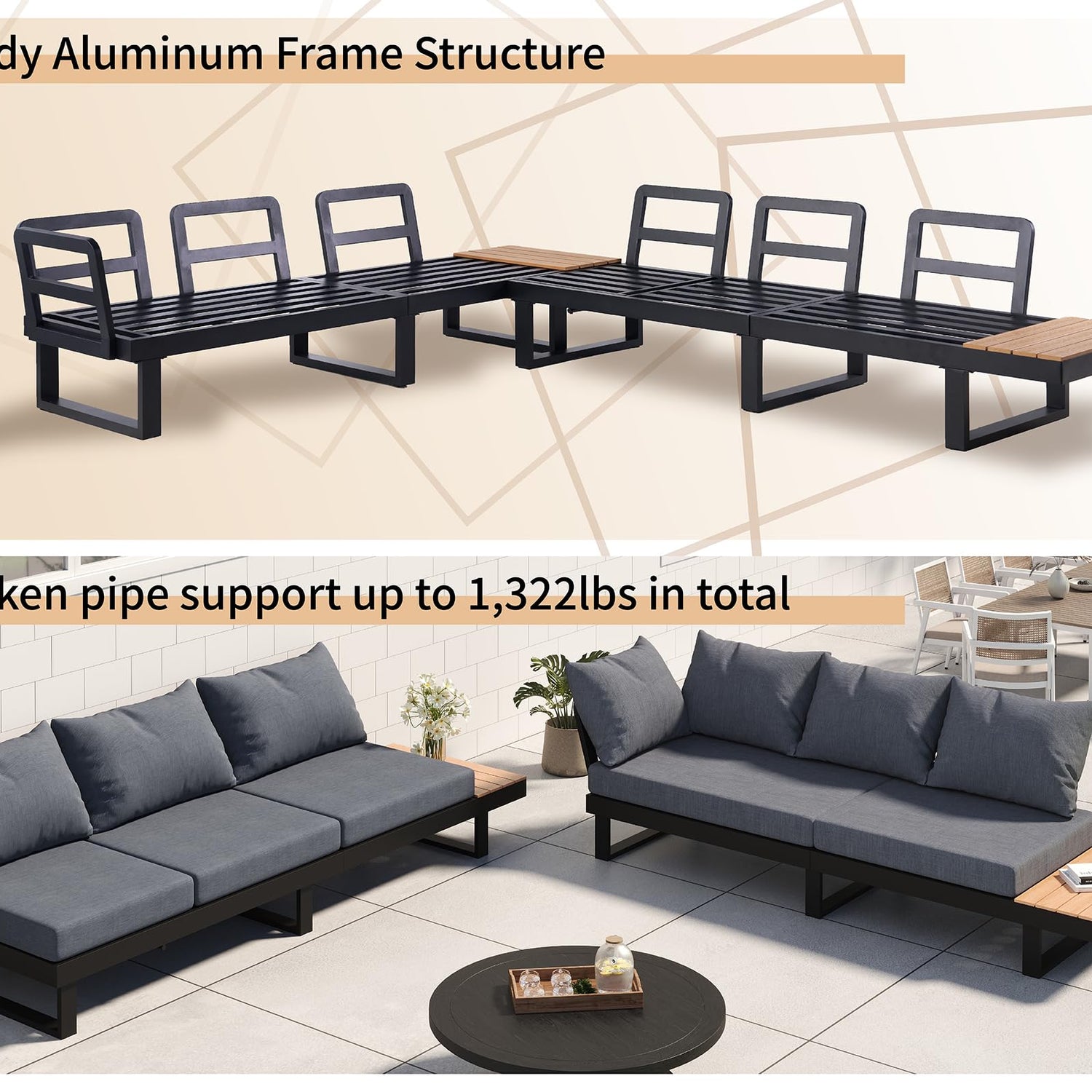 • Modern Aluminum Frame: Crafted from upgraded aluminum with plastic wood side table, brings a simple but fashionable look to outdoor space, lightweight aluminum patio set for easy handling and storage.