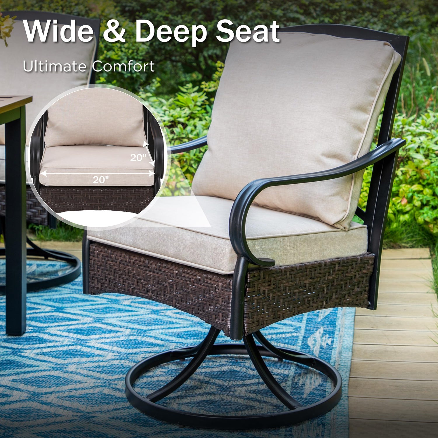 - ๐๐๐ ๐๐ฒ๐ด๐ฟ๐ฒ๐ฒ ๐ฆ๐๐ถ๐๐ฒ๐น ๐๐ต๐ฎ๐ถ๐ฟ๐: The frames of our outdoor dining chairs are made of E-coated metal steel decorated with wicker, stylish and sturdy. They are designed with 360 degree swivel,curved armrests and gentle rocking seats, and you can turn to any direction you prefer