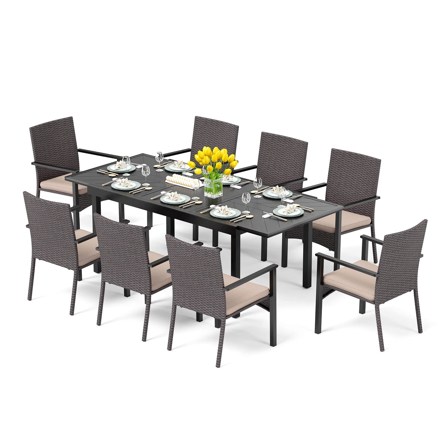 PHI VILLA 9 Piece Outdoor Dining Table Set for 8, Expandable Rectangular Iron Dining Table & Rattan Wicker Chairs with Cushions, Large Dining Furniture Set for Patio, Deck, Yard
