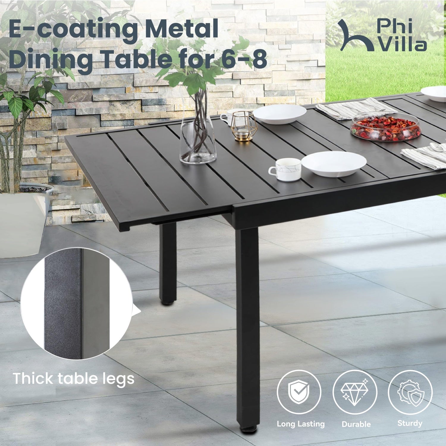 • Extendable Patio Dining Table: The classic extendable table uses a minimalist style design. The use of zinc alloy with powder coated surface makes the table beautiful, durable and easy to clean. With extendable design, the table can be adjusted form 6 to 8 person
