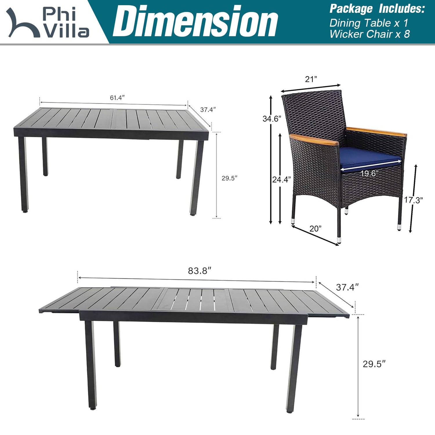 PHI VILLA 9-Piece Outdoor Patio Dining Set for 8, Expandable Rectangular Metal Dining Table & Rattan Cushioned Chairs Furniture Set for Backyard, Deck,