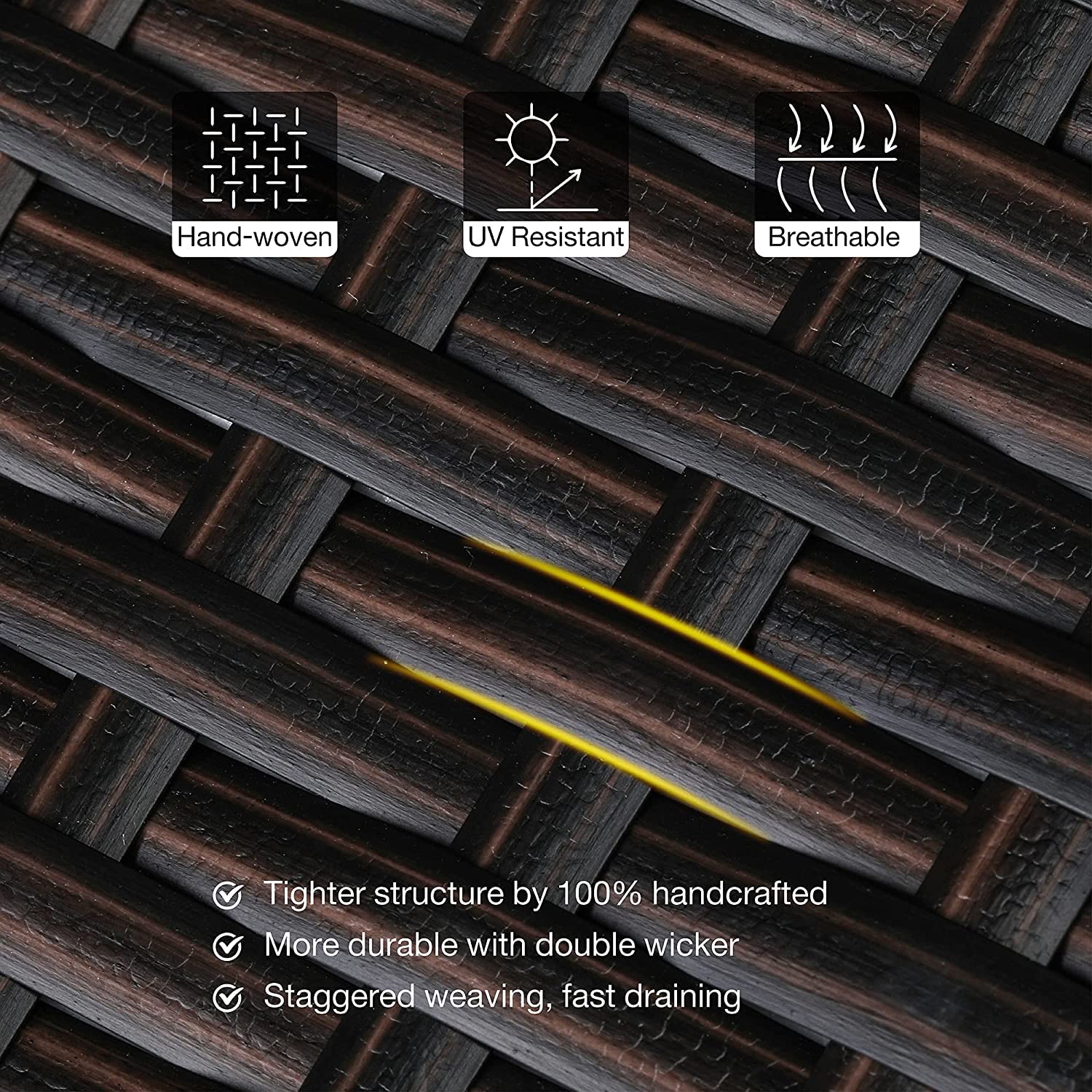 • 8 Rattan Chairs: Full height 34.6" with 2" thick waterproof seat cushions, curved armrests provide a comfortable seat width, up to 24 inches on both sides for different body size. Rust free frame and selective all-weather PE rattan ensure your garden set using for many years, acacia wood armrests add a classic decor in your home