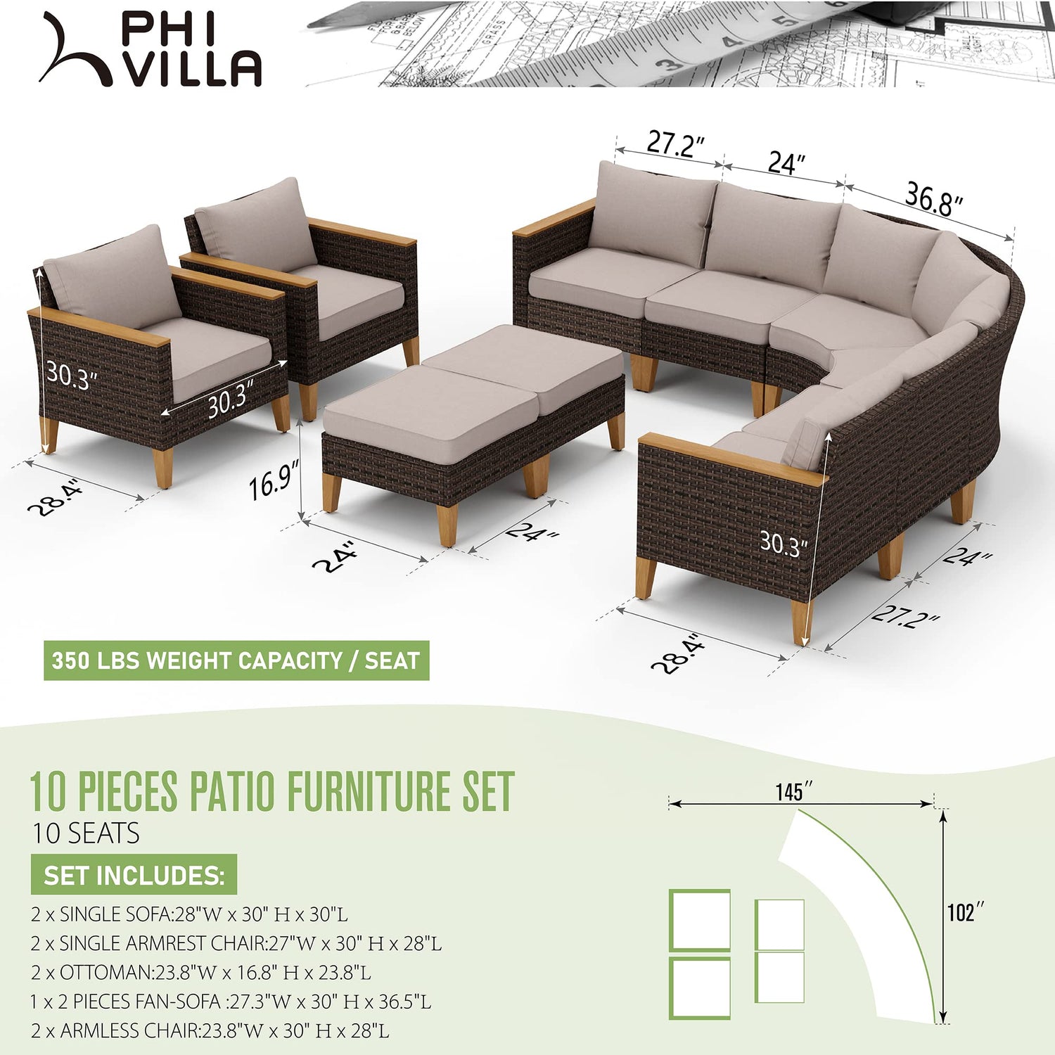 Details: Create An Outdoor Comfort Zone Luxury 10 Pieces Patio Conversation Set WHY CHOOSE US We are committed to helping everyone bring happiness home. That's why PHI VILLA's products are easy to understand, assemble and enjoy. We design tiny reminders that life is good. The most important thing about outdoor sofas, as with life, is what's inside. A naturally strong frame will support years of use. 2 x Single Sofa, 2 x Fan-Sofa, 2 x Armrest Sofa, 2 x Armless Chair and 2 x Ottoman