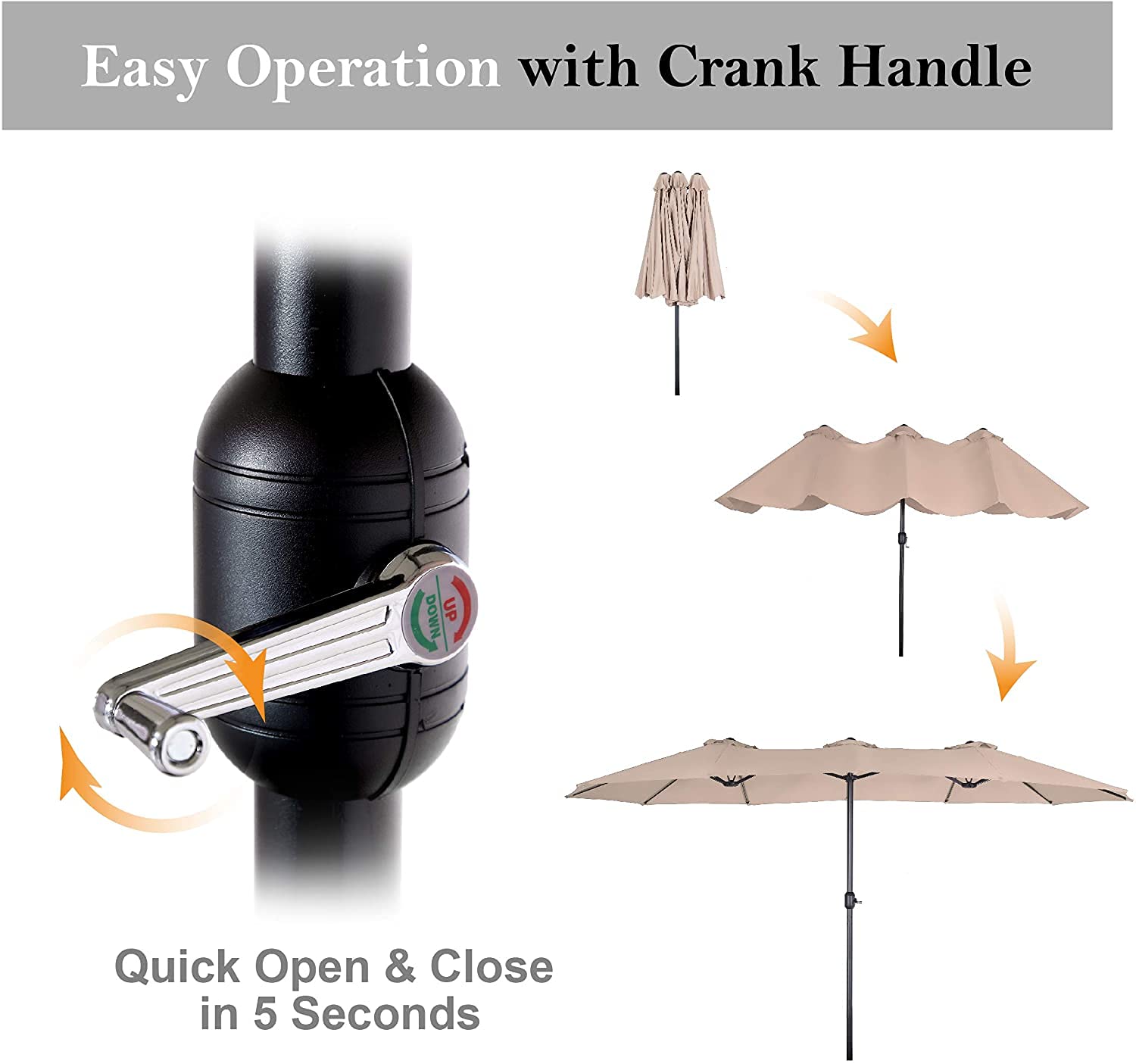 • Patio 13ft Umbrella (Base Not Included): Humanized crank design.Using durable 100% polyester fabric, powder coated aluminum pole and 12 rust proof steel ribs provide enhanced durability to this umbrella, waterproof and breathable. This umbrella canopy is fade resistant. Provides up to 99% UV protection.