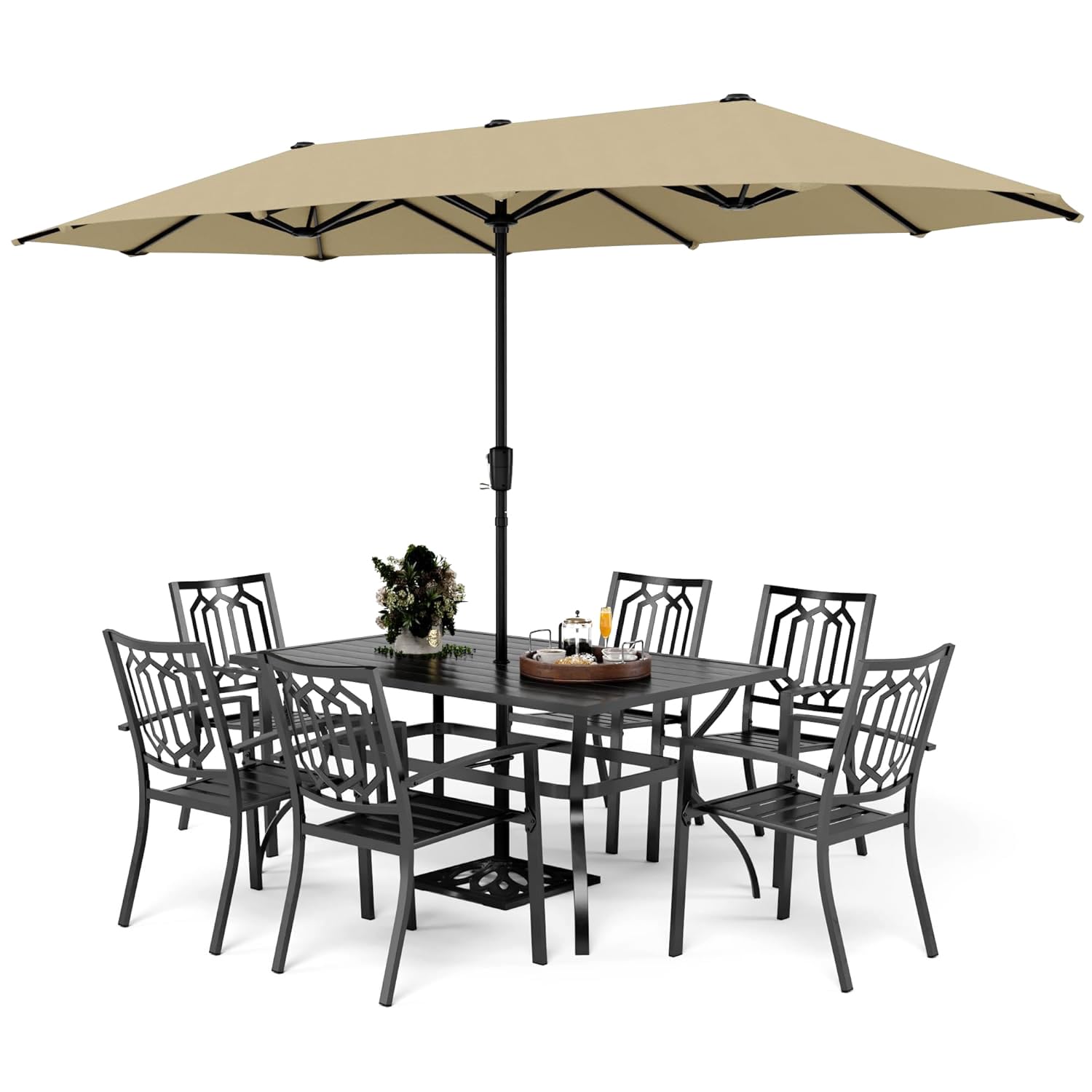 PHI VILLA Patio Dining Set 8 PCS with 13ft Double-Sided Patio Umbrella(Beige),Metal Outdoor Dining Set - 6 x Outdoor Stackable Chairs, 1 x 60"x38"Rectangle Dining Table and 1 Umbrella