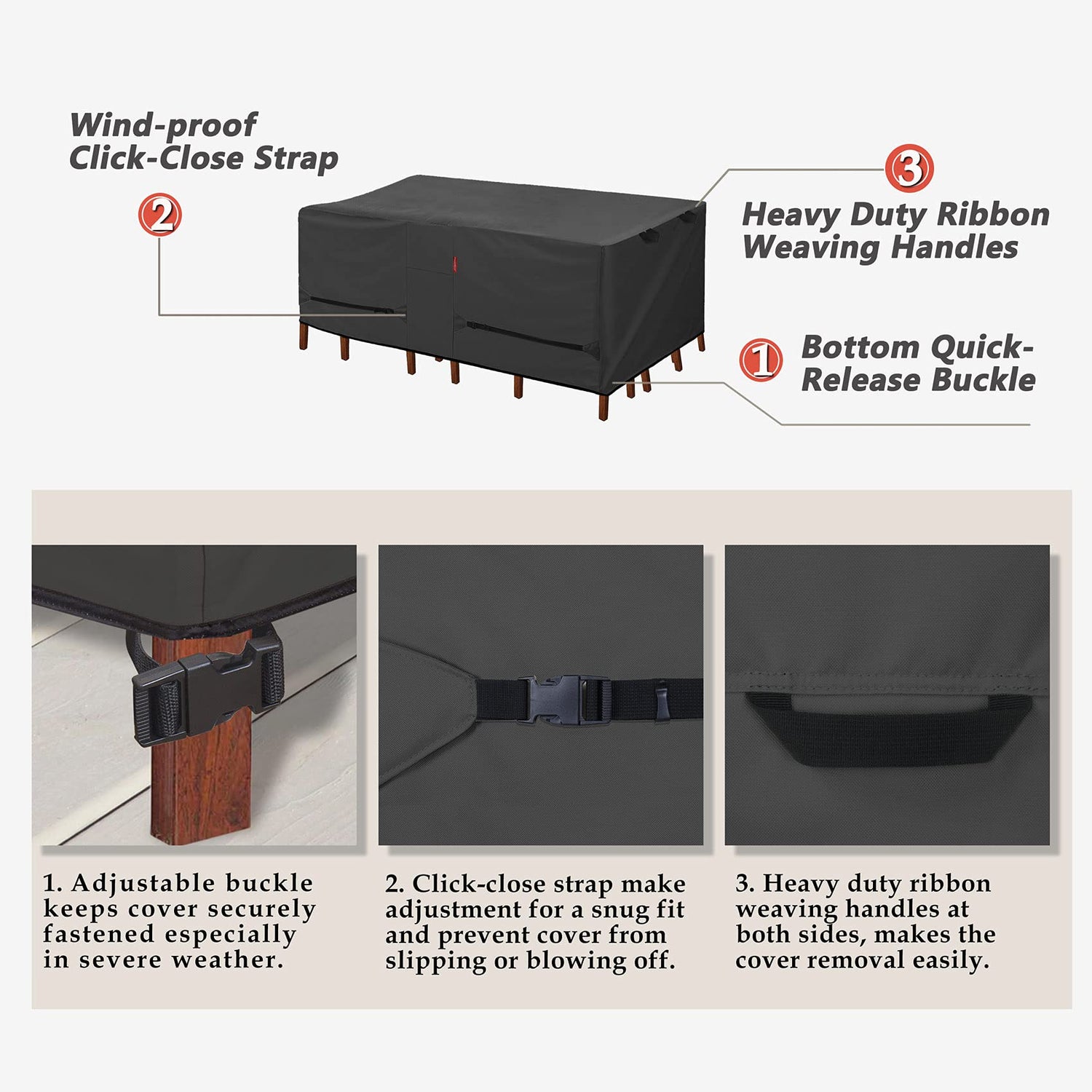 • Product Dimensions - The patio table cover fits outdoor rectangular/oval table with 6-8 Chairs up to 125"(L)x73"(W)x28"(H).
