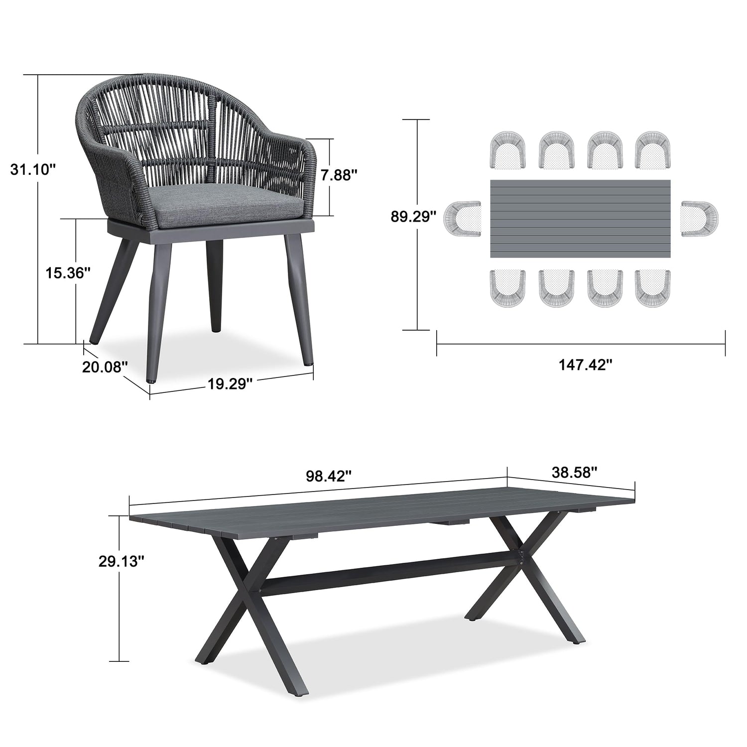 - The all-weather dining table set includes: 1 X dining table (98.42"L x 38.58"W x 29.13"H), 10 X dining chairs (20.08"L x 19.29"W x 31.1"H), and 10 X cushions.